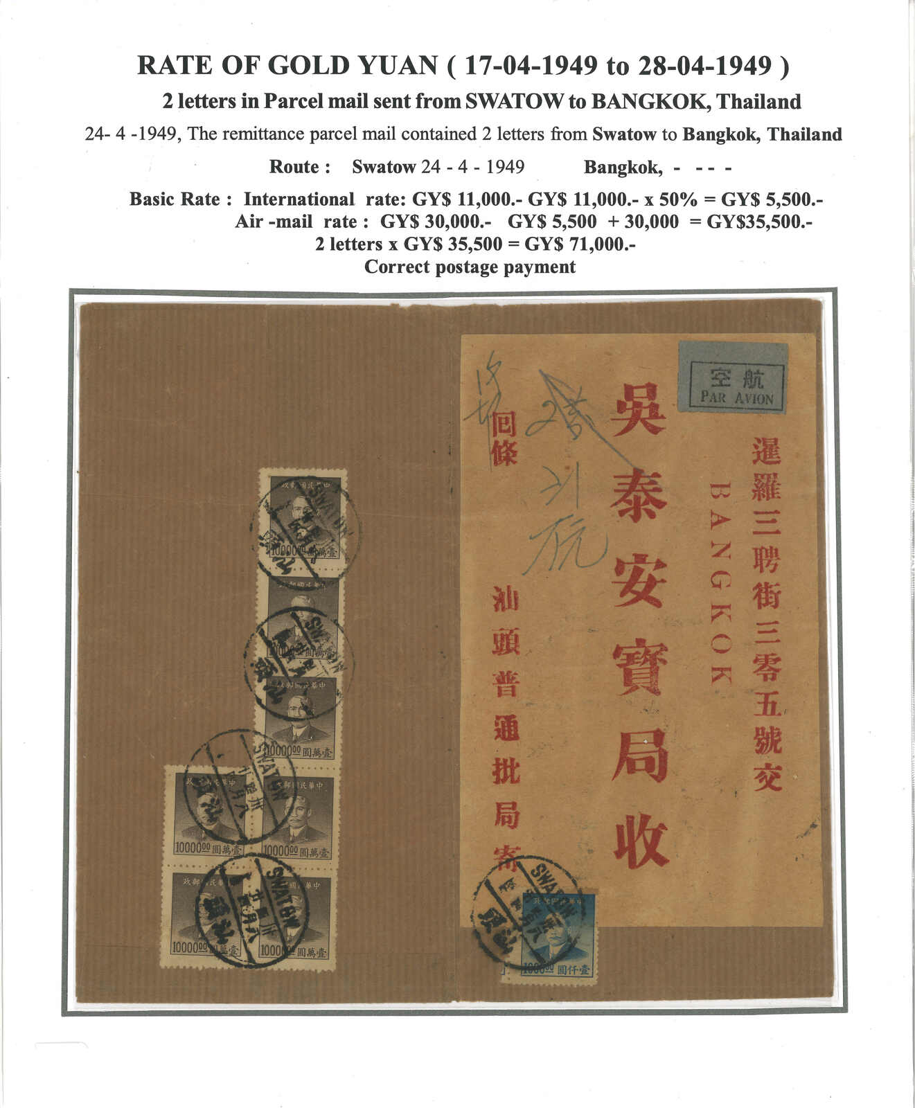 1949.4.24 回批總包,申報內裝回批2件,自汕頭寄曼谷,貼孫像金圓1萬元七方連 + 1000元,合71000元(每件回批特惠半費郵資5500元 + 航空費30000元,共2件),銷汕頭三格漢英日戳。稀罕難得之僑批總包例子。(Image 1)