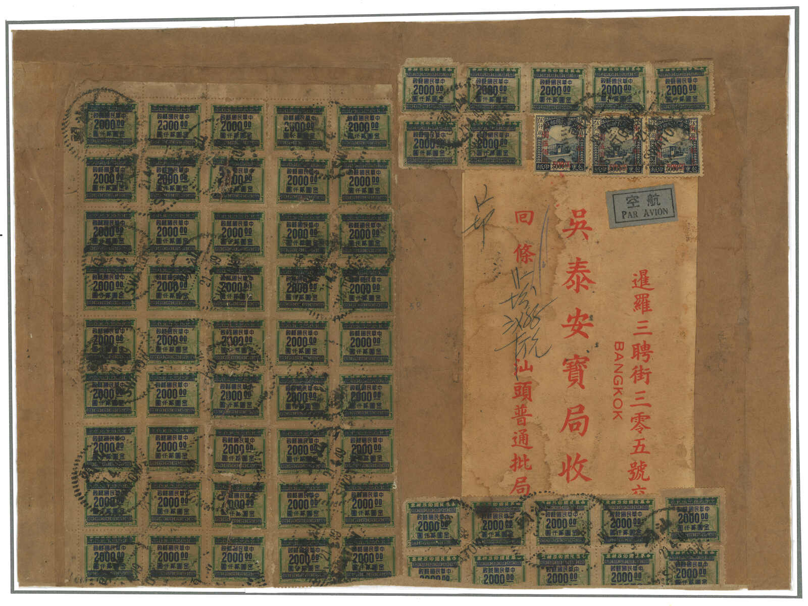3835 cover image1949 (2 May) Huipi (receipt of remittance) bulk mail stating containing 16 letters from Swatow to Bangkok, applied with 5 strikes of Swatow Gold Yuan meter stamp + SYS Gold Yuan $10000 in pair, in total of Gold Yuan $3.92m = Silver Yuan $5.6 (Huipi concessionary half rate Silver Yuan 5c + airmail rate 30c per letter), tied by Swatow bilingual cds. Huipi bulk mail is always scarce, not to mention Gold Yuan usage during Silver Yuan period. Cover opened out for display.
