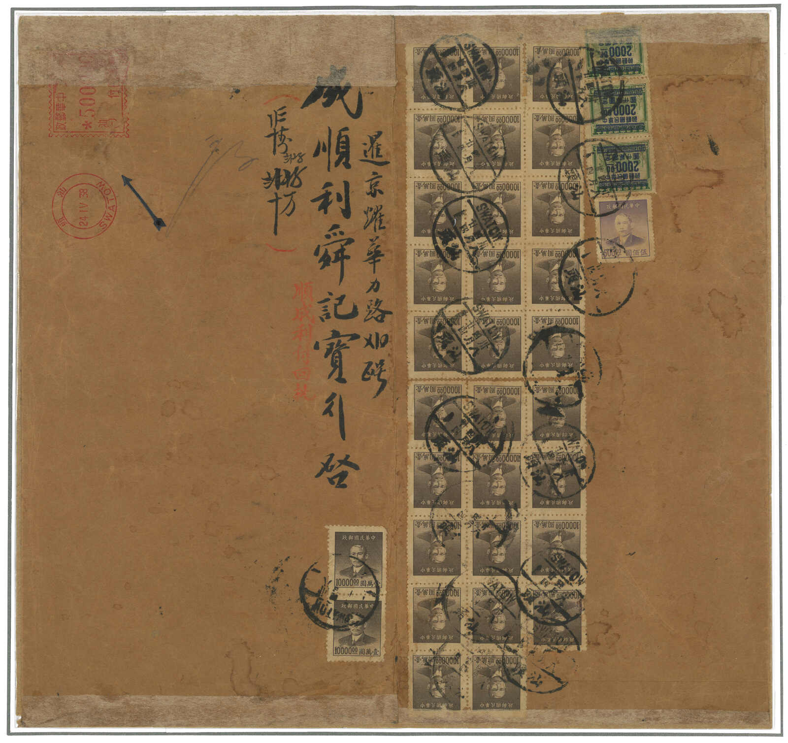 1949.5.2 回批總包,申報內裝回批16件,自汕頭寄曼谷,鈐郵政已付金圓機戳並貼孫像金圓1萬元雙連,合392萬即銀圓5元6角(每件回批特惠半費郵資銀圓5分 + 航空費3角,共16件),銷汕頭三格點線漢英日戳。稀罕難得之僑批總包例子,銀圓時期沿用金圓更是出色。封剖開以作展示。(Image 1)