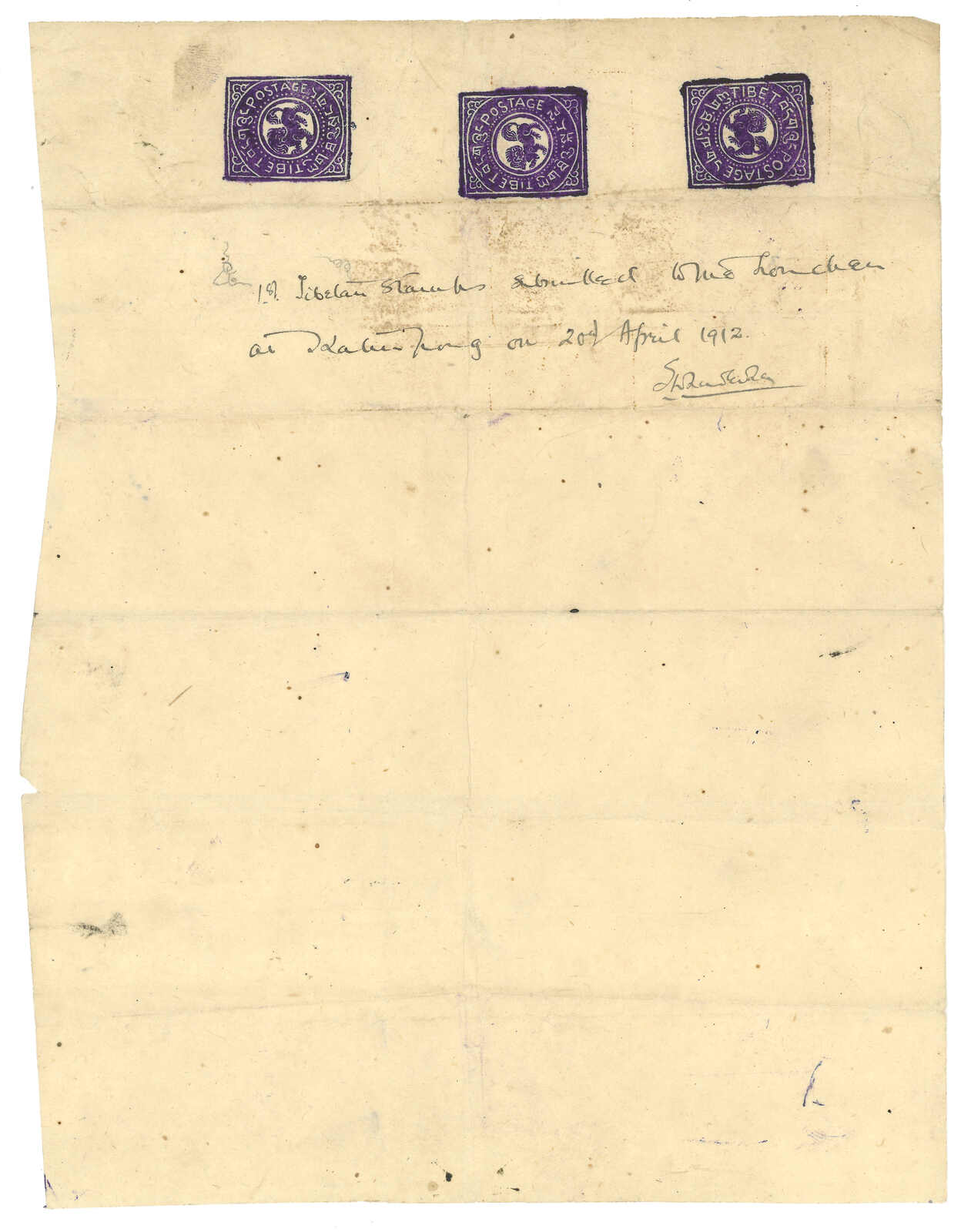西藏獅圖第一版1兩、1/3章噶及1/6章噶紫色母模樣張,寫有批注“為1912年4月20日提交噶倫堡倫欽之西 藏郵票/萊登拉。”外觀與後來發行的子模不同。萊登拉為達賴喇嘛聯絡官。倫欽即為首席噶倫。稀罕萬分。 附Geoffrey Flack證書。蔡盛及王劍智著《青康藏郵驛史》第237頁圖例6號原件。(Image