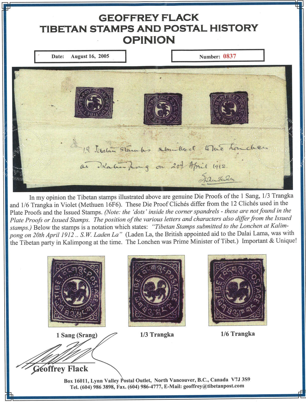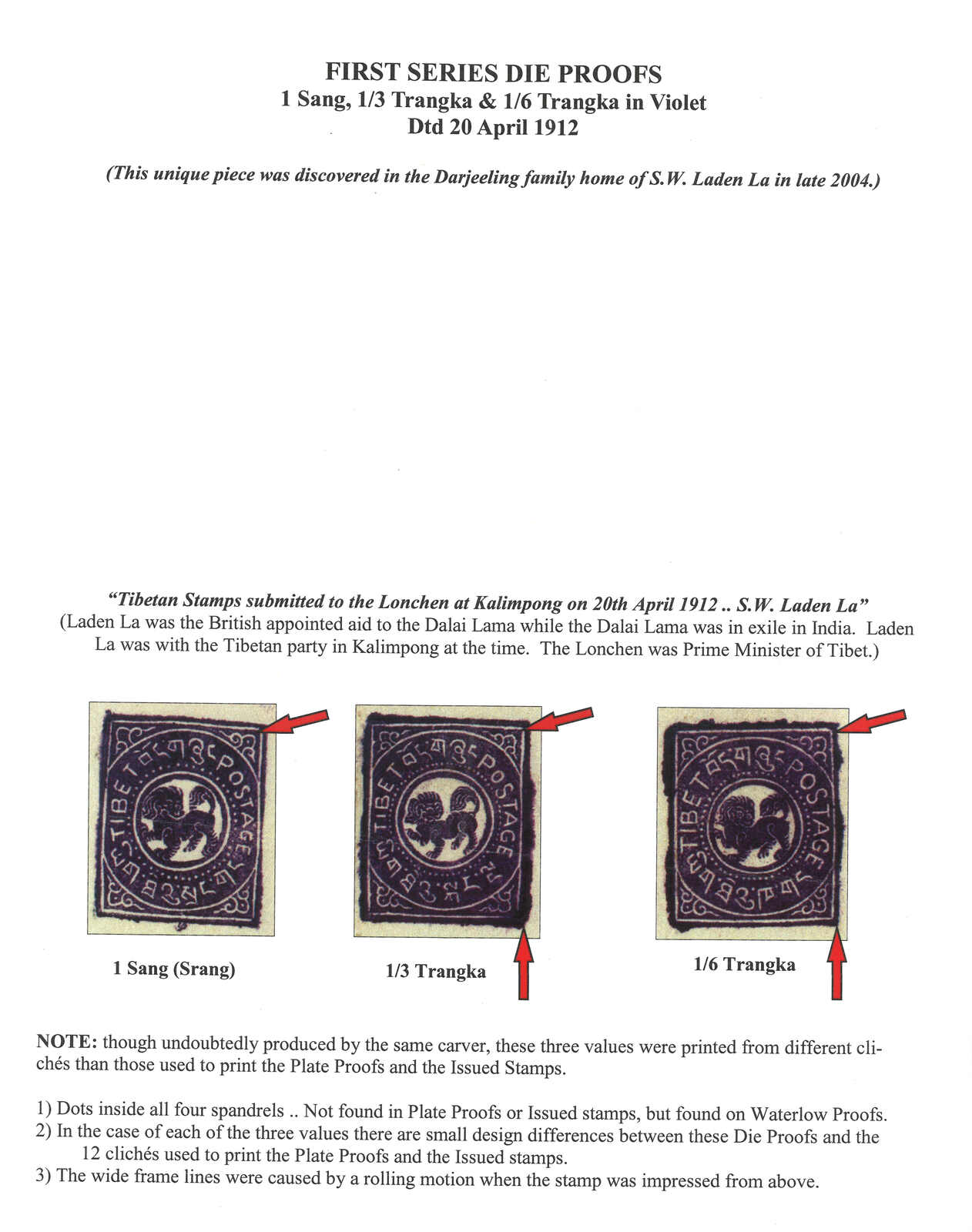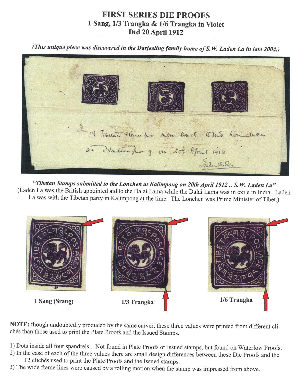 Tibet 1st issue 1 Srang, 1/3t and 1/6t die proof in violet, showing annotation “Tibetan stamps sumitted to the Lonchen at Kalimpong on 20th April 1912. S.W. Laden La.” The die proof cliches differ from the cliches used i n the