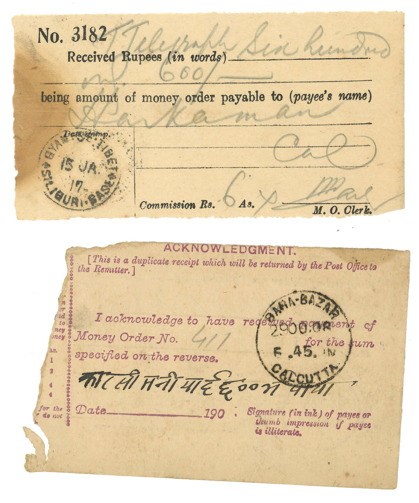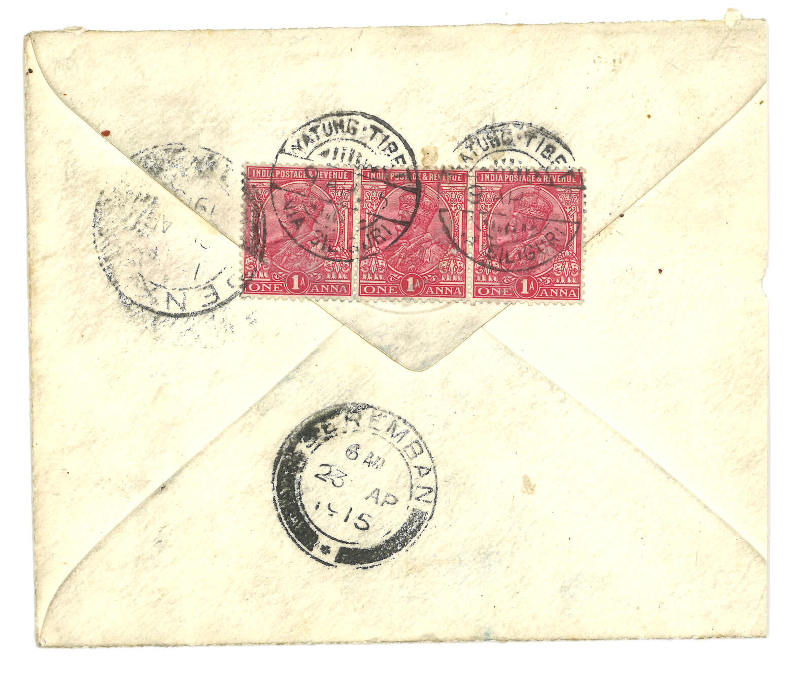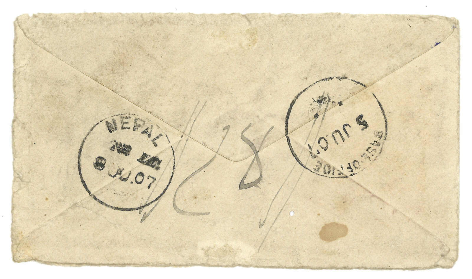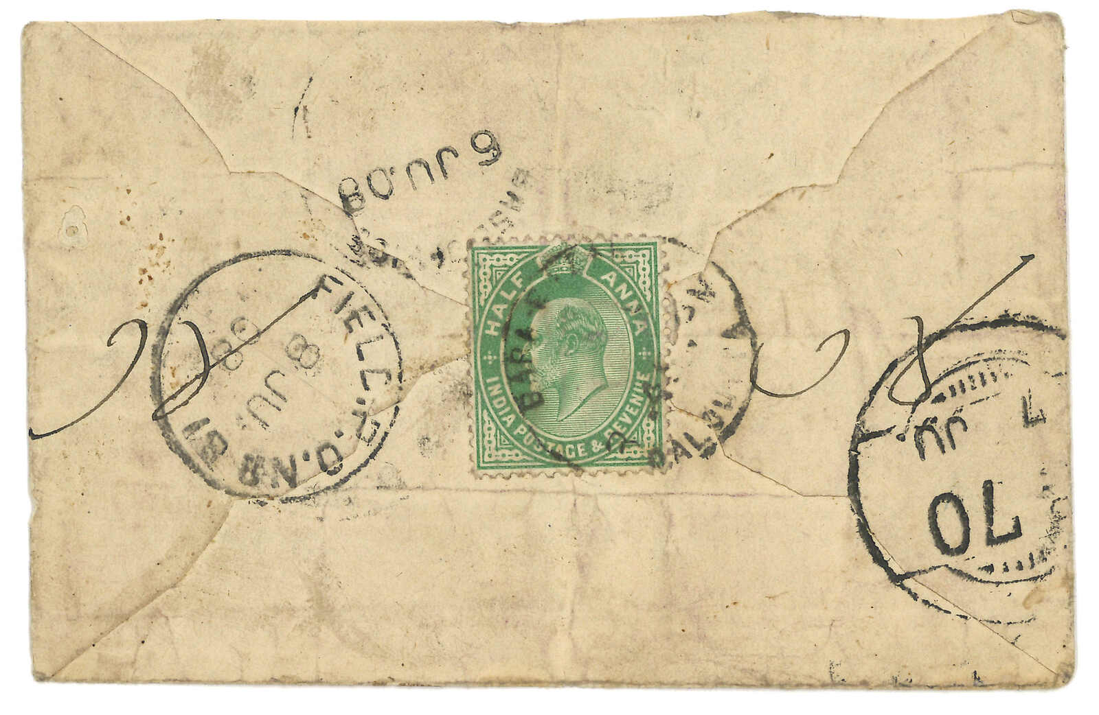 1908年印度寄帕里,背貼印度愛德華七世半安娜,銷加爾各答日戳。6.6經基地郵局,6.6經春丕,鈐珍罕之軍郵70局B2a型日戳。6.8抵帕里,鈐同樣少見之軍郵81局B1型日戳。鈐有兩枚珍罕郵戳之出色例子。帶折痕。(Image 1)