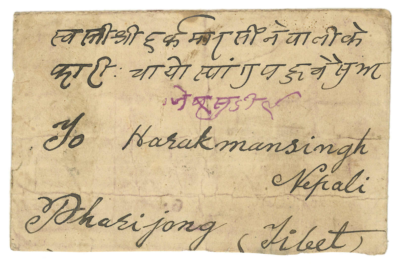 1939 (Feb) Lhasa to Nepal via Pharijong. Taxed cover, f.w. Indian KGVI 1a on reverse, tied by Pharijong cds. On front showing Pharijong FPO No. 81 due mark and Nepalese due mark for 1a. As this cover was underpaid for 1/2a,