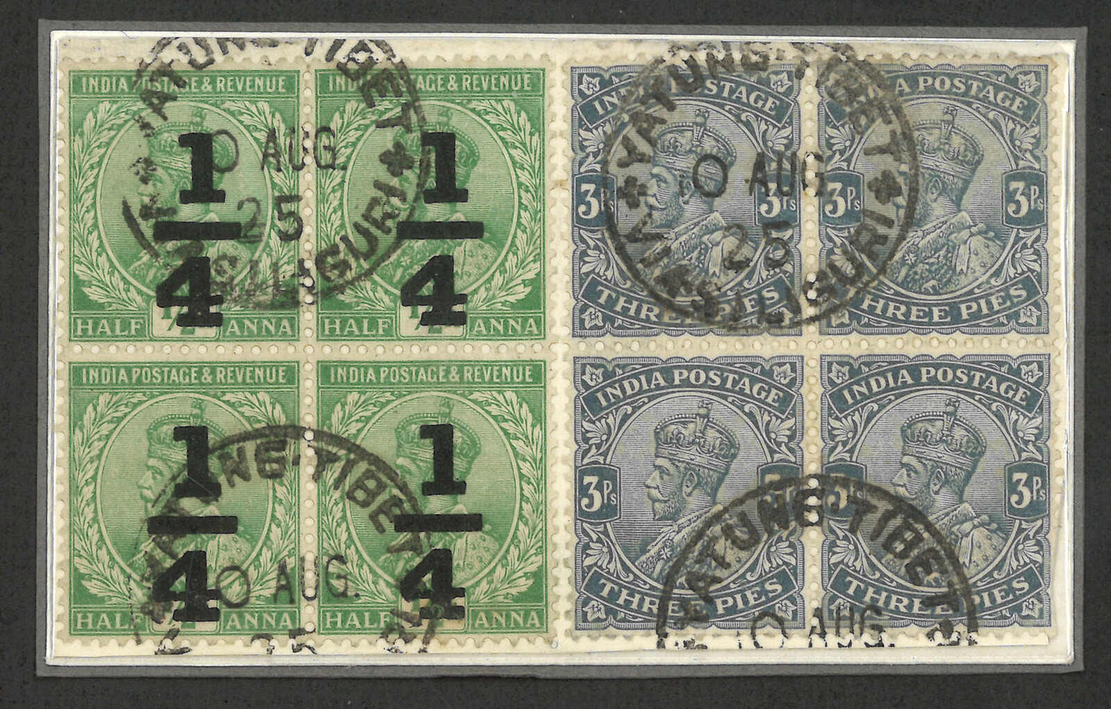 1922 (7 Feb) Indian KGV 2a on piece, tied by extremely scarce Pharijong Experimental PO B-519 type B1 cds. It is the only example of the Experiemntal PO B-519 recorded by Waterfall. Illustration p. 119 in "Tibet and Stamps and