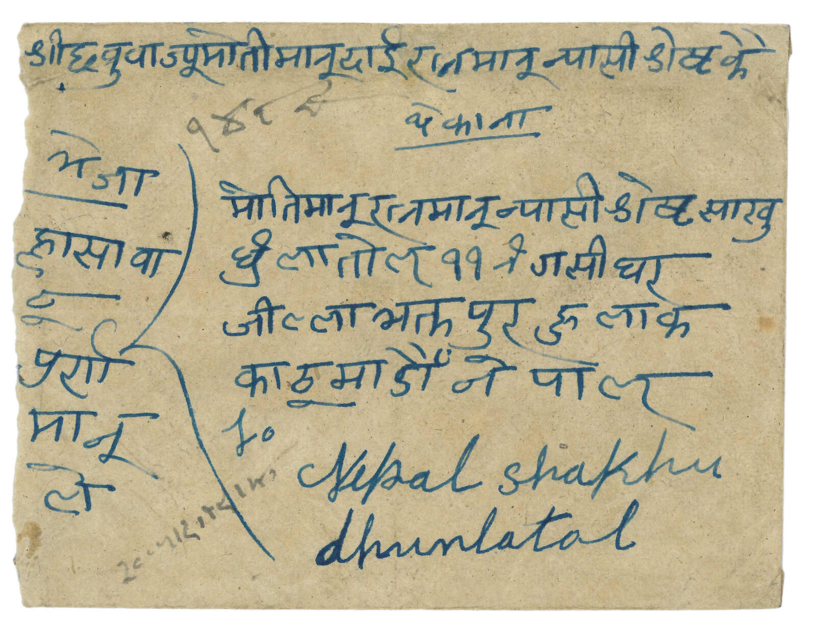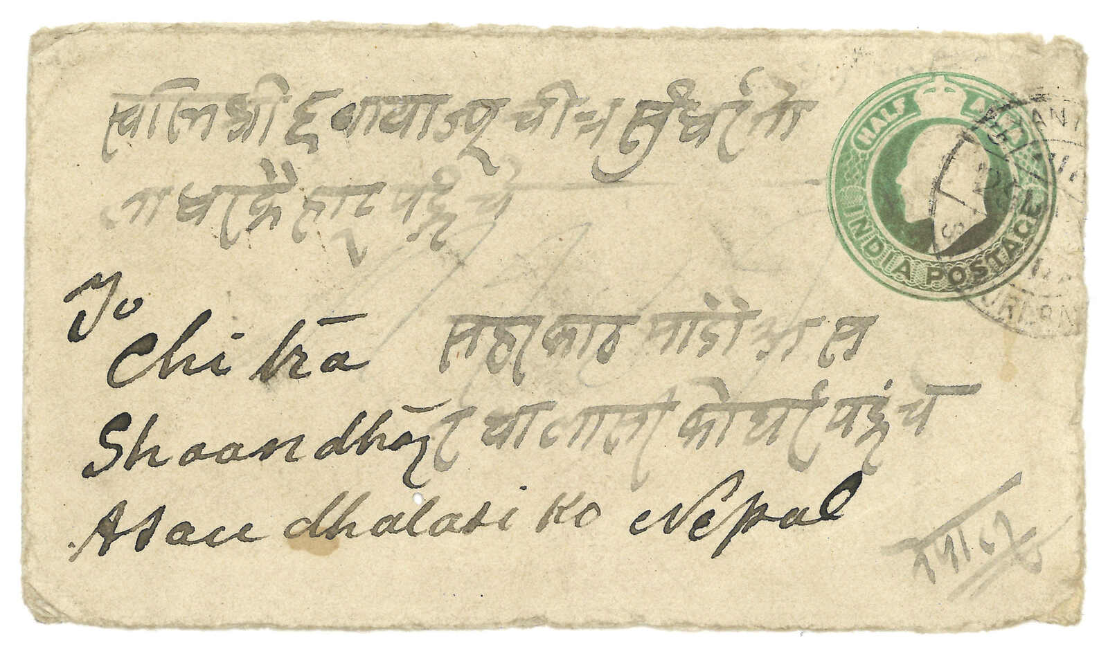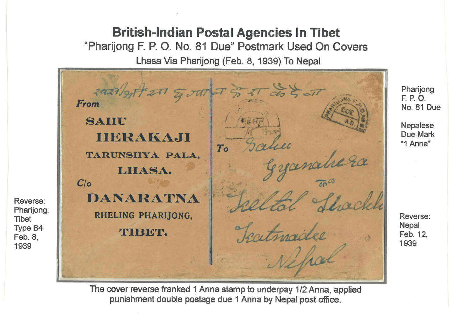 1939.2 拉薩經帕里宗寄尼泊爾。欠資封,背貼印度佐治六世像1安娜,銷帕里宗日戳。正面鈐有帕里宗第81軍郵局欠資章及尼泊爾1安娜欠資章。由於欠資半安娜,被罰欠資雙倍1安娜。(Image 1)