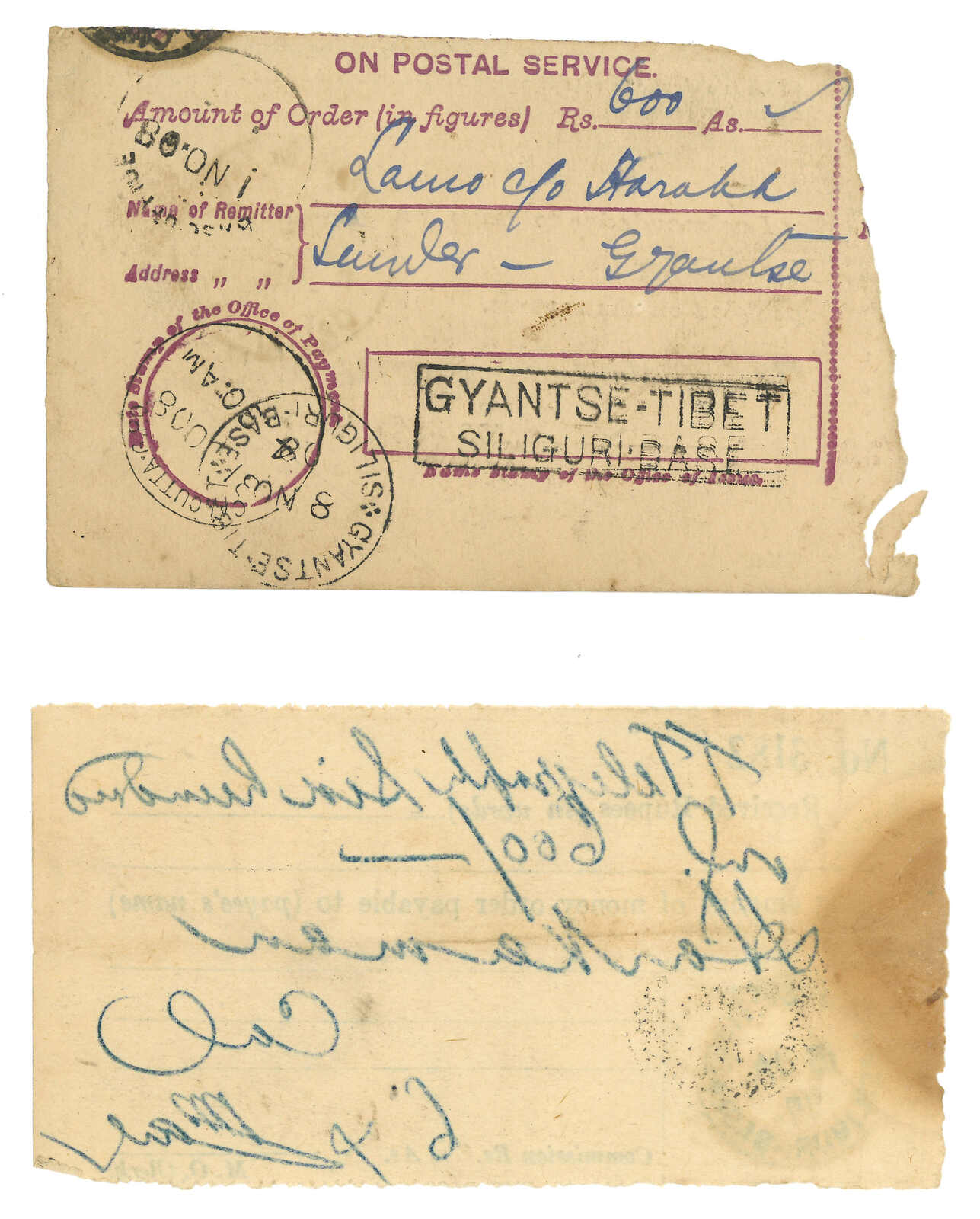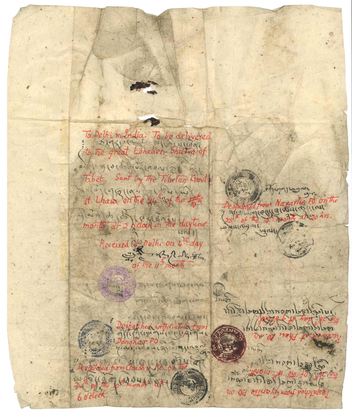 西藏地方郵政排單,蓋有從拉薩出發至德里的沿路郵局戳記,包括江孜、曲水、帕里、浪卡子、白地及東嘎。西藏郵學之一大珍品,集多枚珍罕郵戳於一身。蔡盛及王劍智著《青康藏郵驛史》第311頁圖例29號原件。(Image 1)