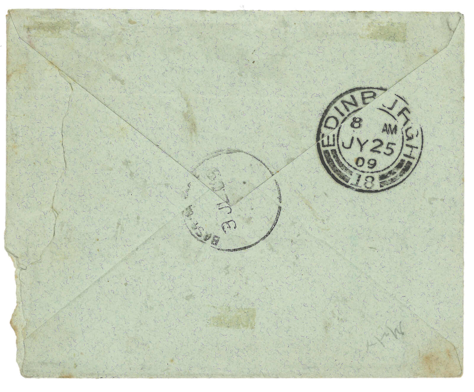 1908 India to Pharijong, f.w. Indian KEVII 1/2a on reverse, tied by Calcutta cds. Transit Base Office (6 Jun), Chumbi (6 Jun) with scarce FPO No. 70 type B2a cds. Arrived Pharijong (8 Jun) with also scarce FPO No. 81 type B1