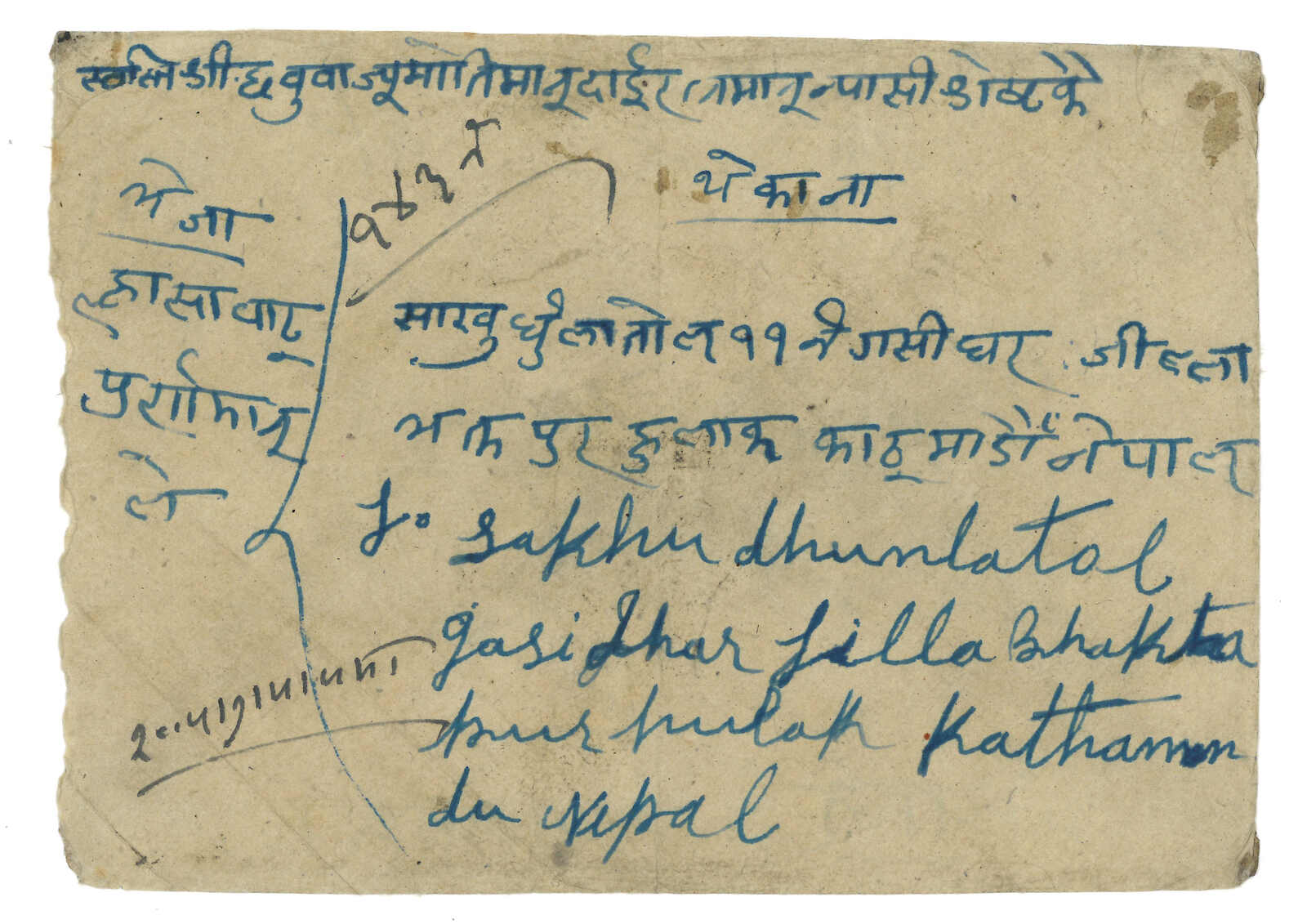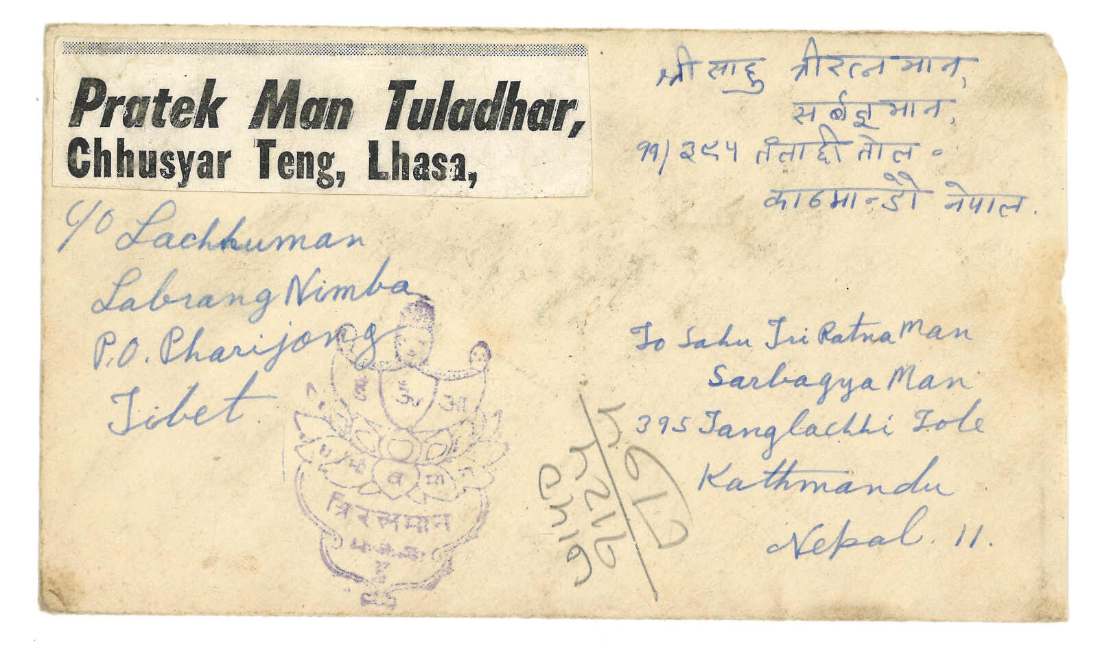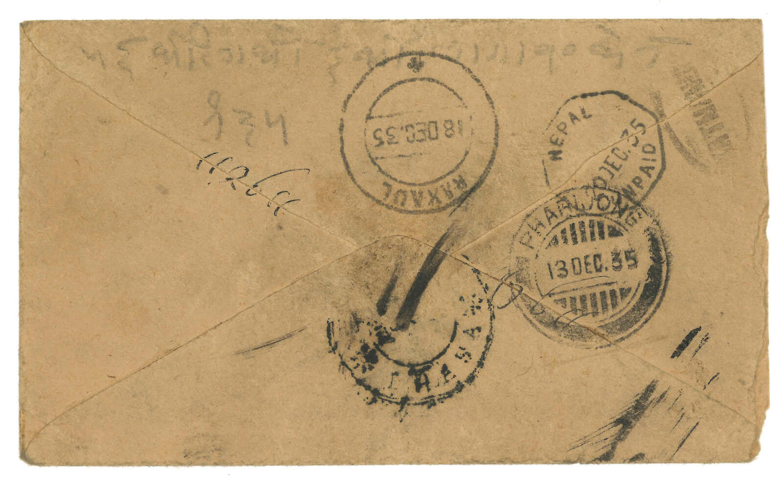 1935年拉薩寄加德滿都,鈐拉薩T42型始發圓戳。12.13經帕里宗,另鈐軍郵81局欠資章。12.18抵Raxaul。(Image 1)