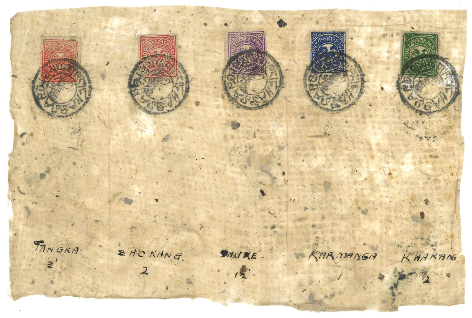 absolute rarity of Tibetan philately, gathering multiple scarce seals on one sheet. Illustration from “Tibet Stamps and Postal History” by Steven Chazen and Danny Wong fig 29, p. 311.