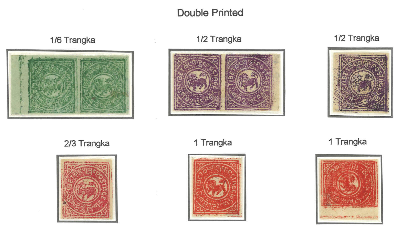 1912 a collection of Tibet 1st issue double-impression variety stamps, containing 6 examples from 1/6tr to 1tr singles and multiples. Scarce.