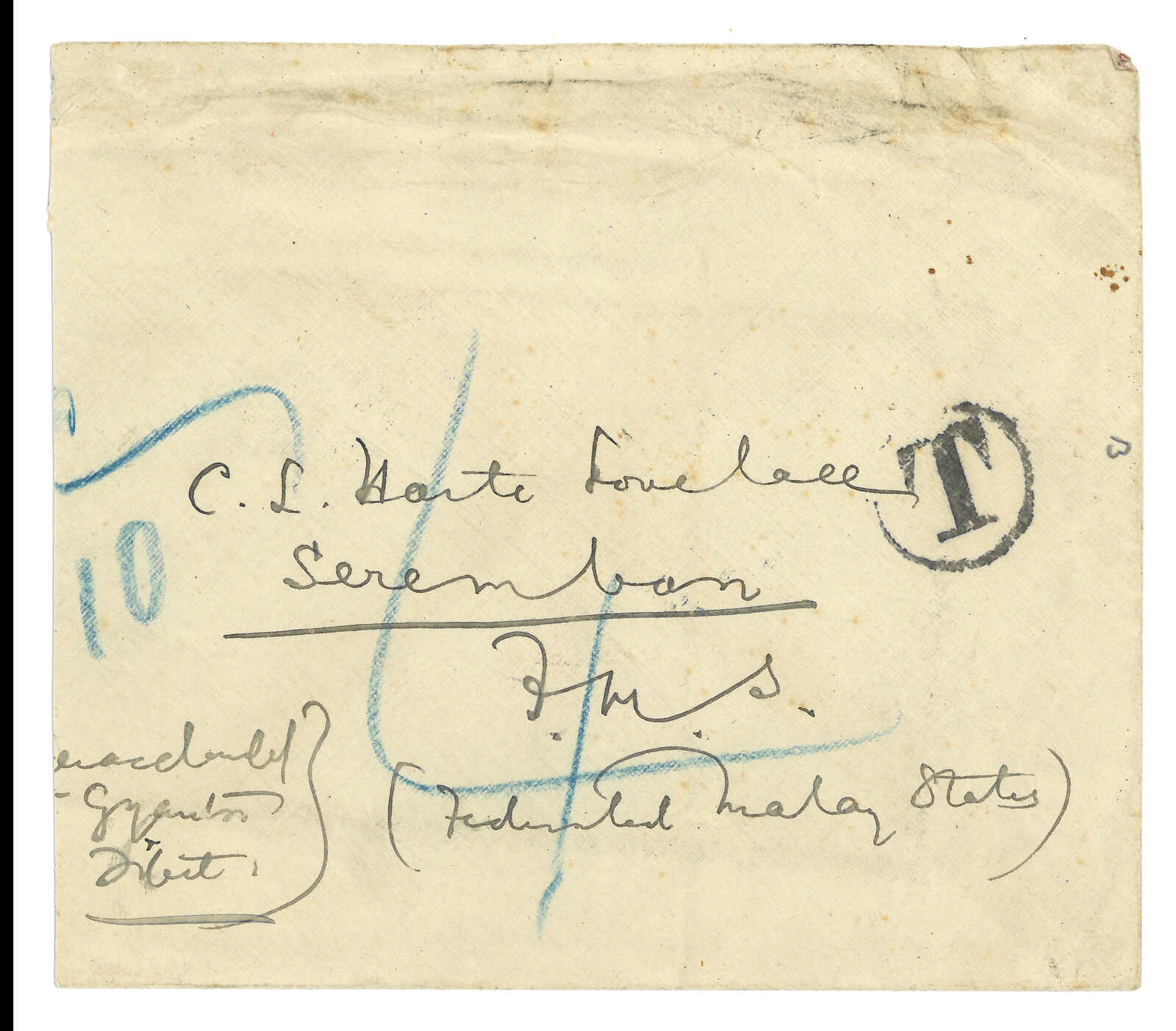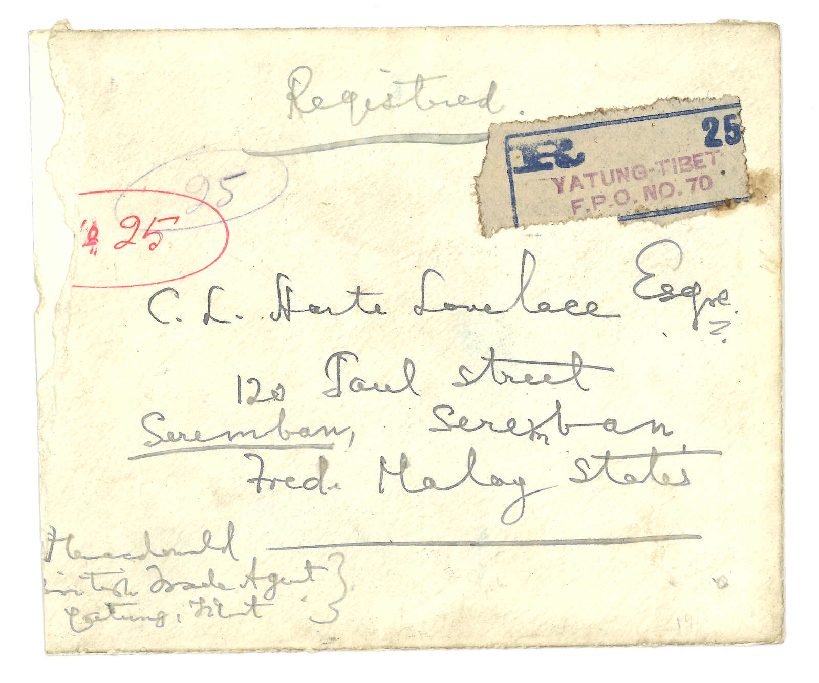1915年一對欠資及掛號封由英國商務專員Macdonald自江孜寄馬來亞,均貼印度佐治五世票,銷亞東英局日戳。前者鈐有未見記錄之T章,後者則貼有亞東軍郵70局type YC掛號標籤。寄馬來亞相當少見。(Image