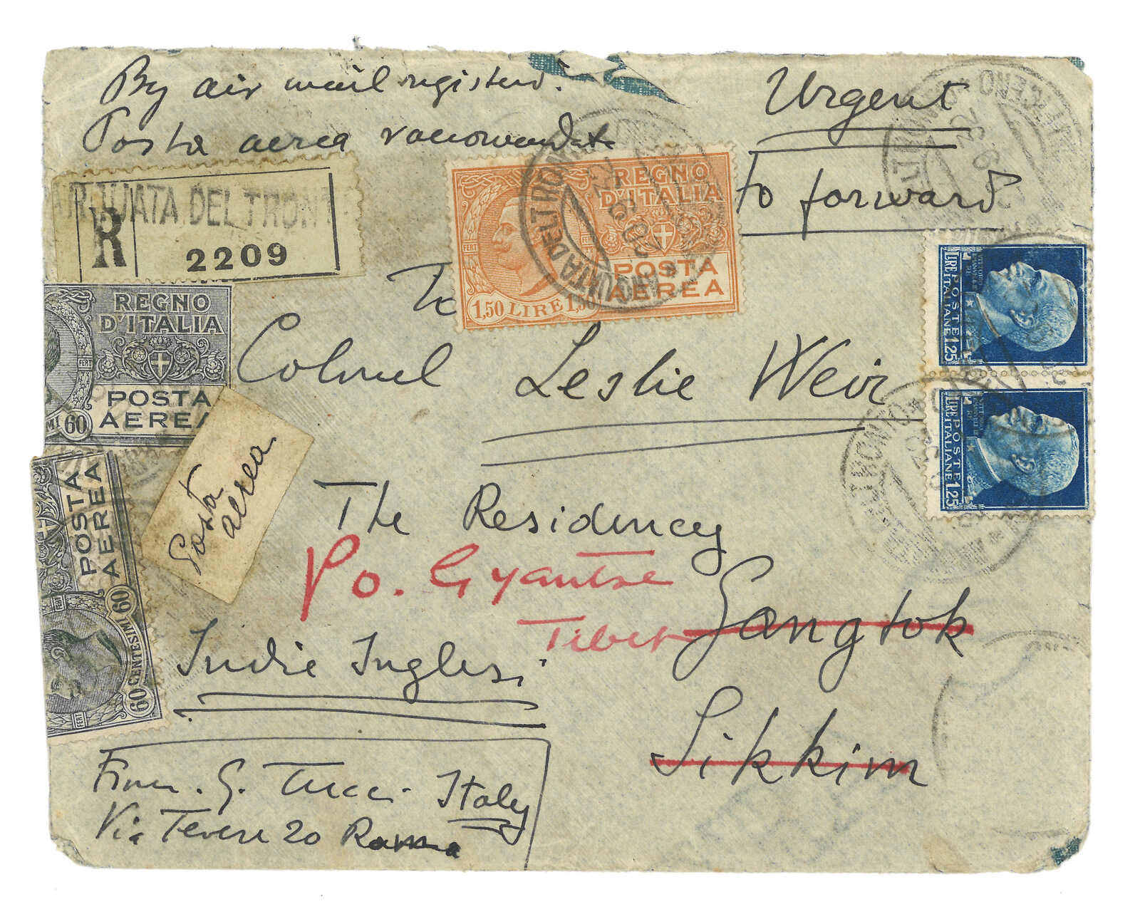 1932 Professor Tucci from Italy (20 Sep) to political officer Col Leslie, Gangtok, redirected to Gyantse, f.w. Italian issue x5, tied by Arquata del Tronto cds., alongside with registered label. Arrived Gangtok (2 Oct).