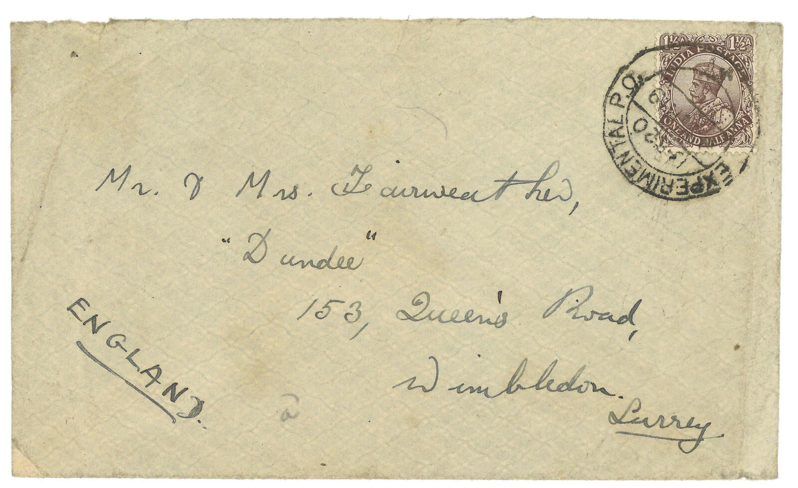 1919 Experimental PO B-520 (3 Sep) to England, f.w. Indian KGV 1-1/2a, tied by extremely scarce Experimental PO B-520 cds. It is the only known example of the B-520 PO. Extremely scarce. An absolute rarity. Illustration from