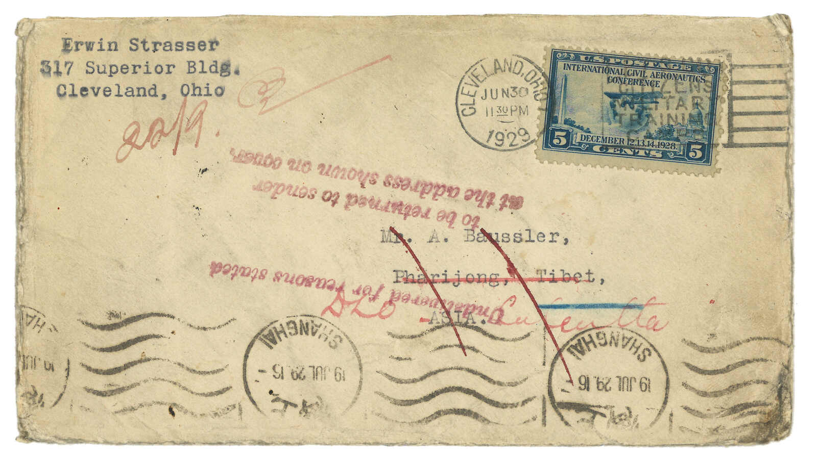1929 USA (30 Jun) to Pharijong, returned to sender, f.w. US 5c, tied by Cleveland meter stamp. Transit Shanghai (19 Jul). Arrived Pharijong (15 Aug) with “INCONNU” cachet. Departed from Pharijong (18 Aug) for Calcutta DLO (22