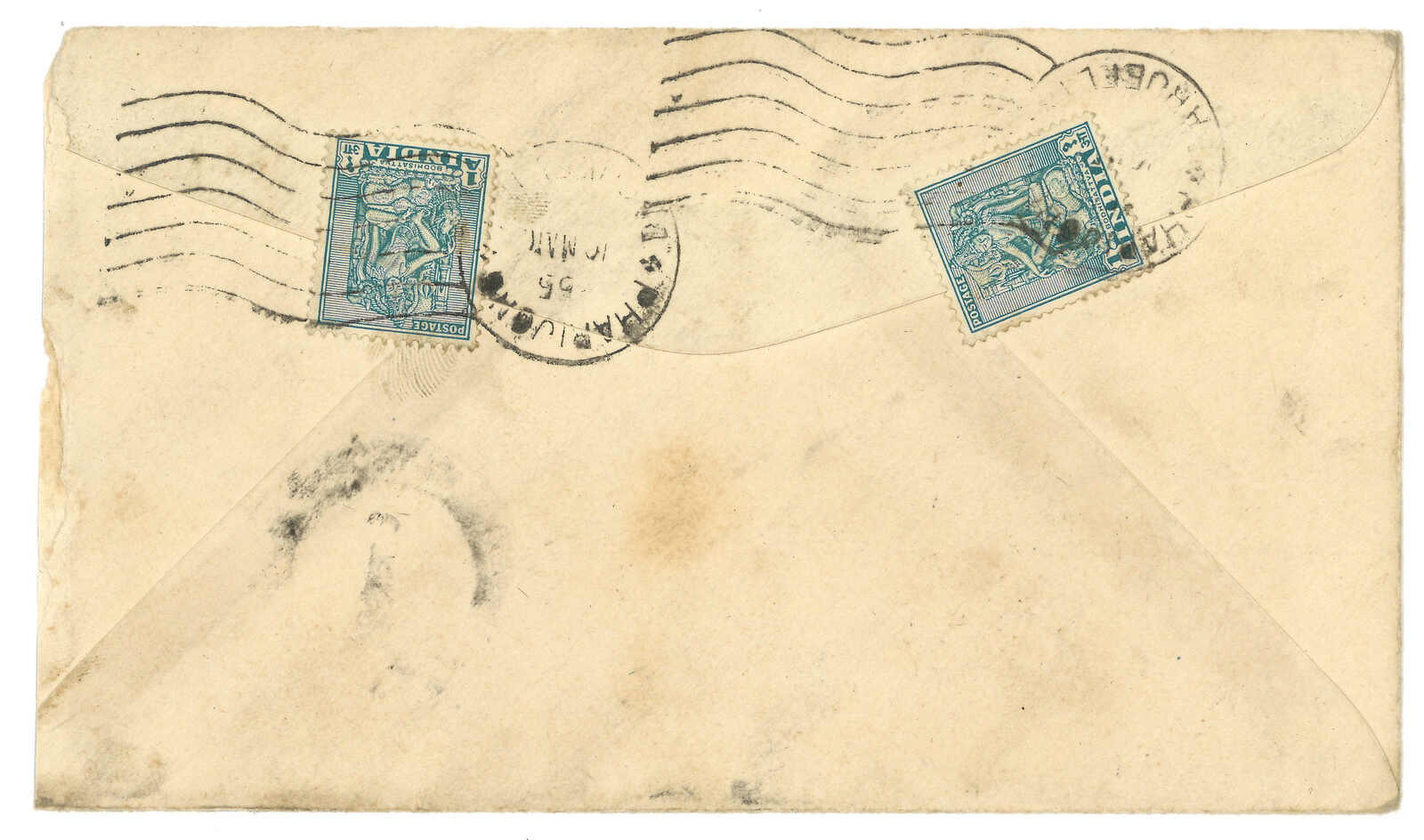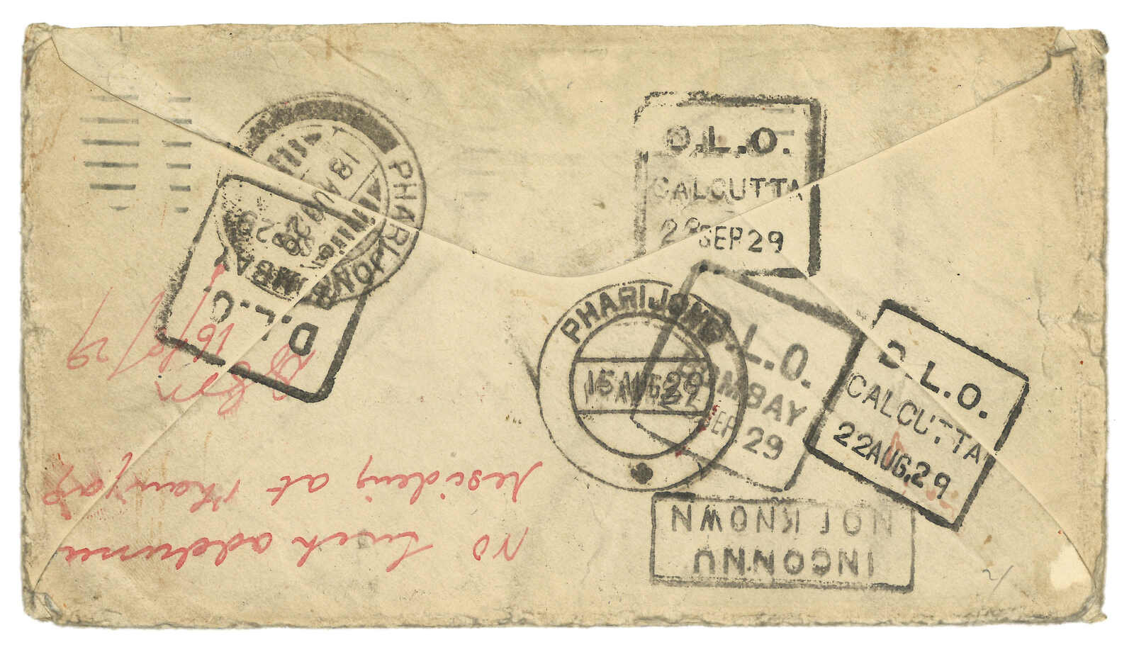 1929.6.30 美國寄帕里宗,退回寄件人,貼美國票5分,銷克里夫蘭機戳。7.19經上海。8.15抵帕里宗,鈐“INCONNU”戳記。8.18離開帕里宗,9.22抵加爾各答死信局。9.25抵孟買死信局。(Image