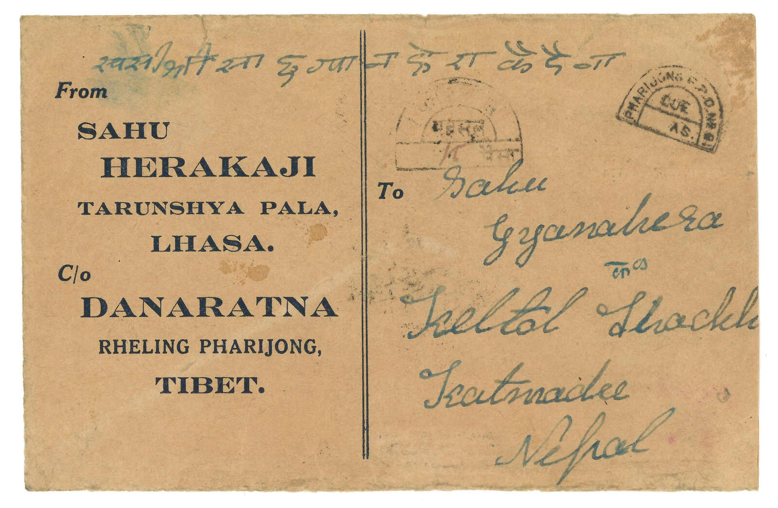 1935 Lhasa to Kathmandu, frankless, applied with Lhasa type T42 h.s. Transit Pharijong BPO (13 Dec), matching with FPO No. 81 Due mark on front. Arrived Raxaul (18 Dec).