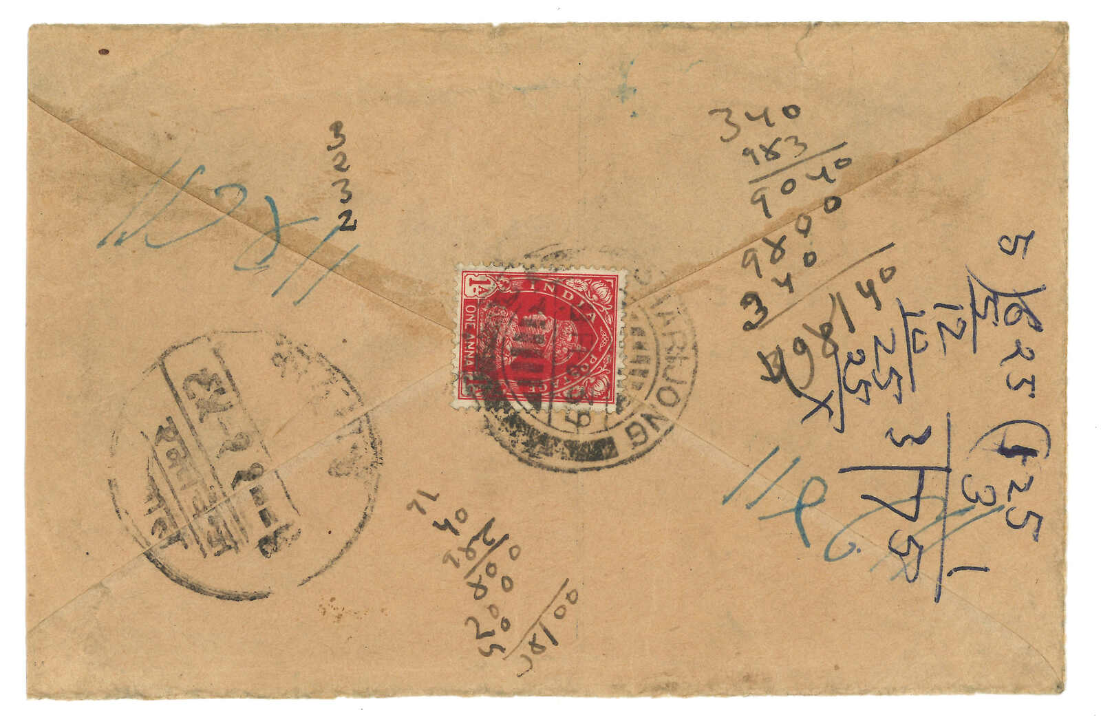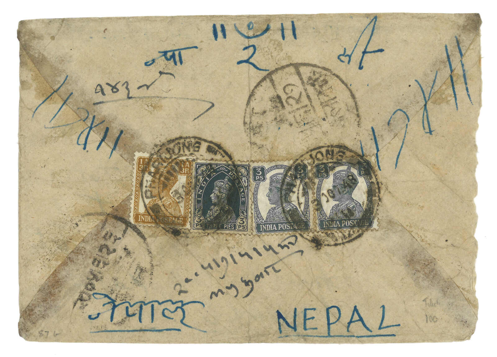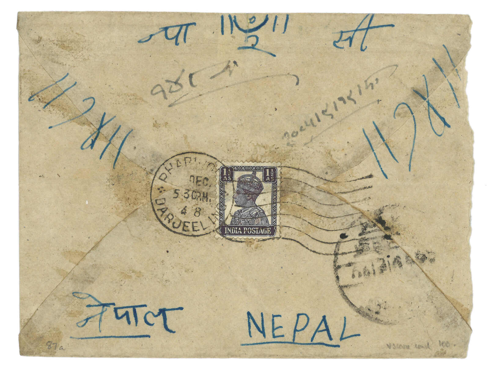F.w. Britain 2-1/2d upon arrival at Surrey (26 Jan). 2020 (Dec) David Feldman, lot 41182. On 6 Jul 1936, the expedition returned to Gangtok and found that all the mails since April were not delivered. Unsent mails were found in the postmaster’s