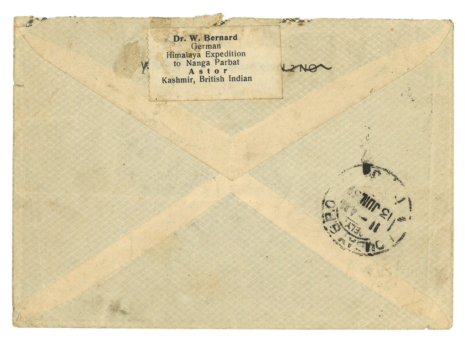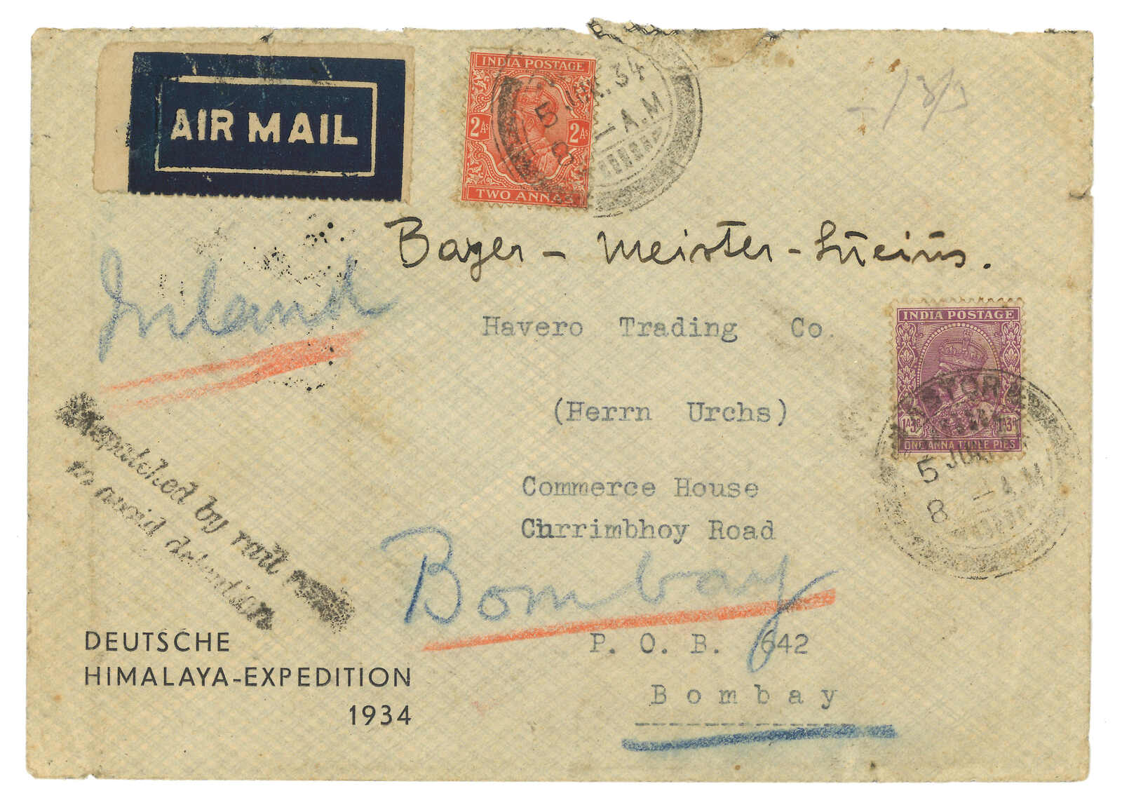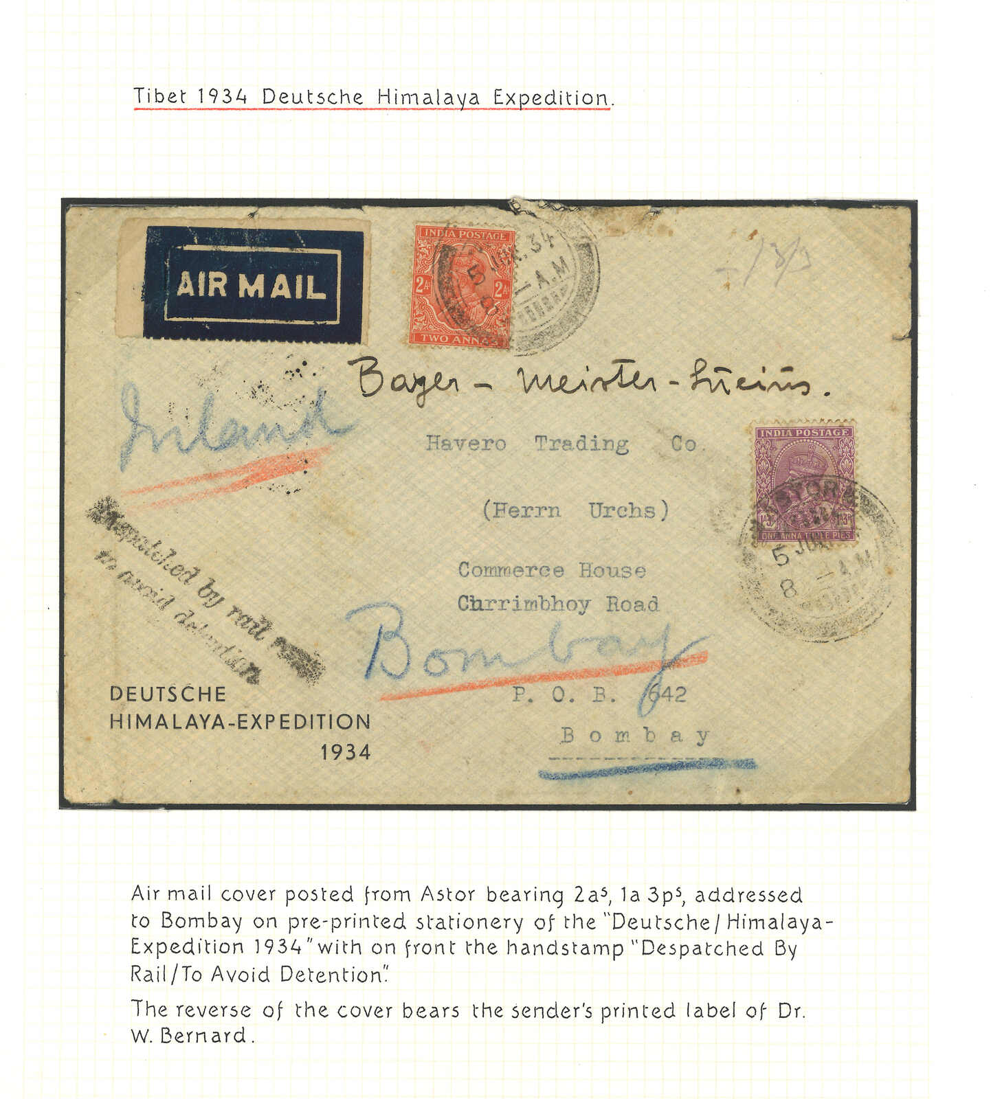 1934 German Himalaya expedition cover from Astor (5 Jun) to Bombay, f.w. Indian KGV 1a3p + 2a, tied by Astor cds. Showing Despatched by Rail / to Avoid Detention” cachet on front despite airmail label. On reverse with label of