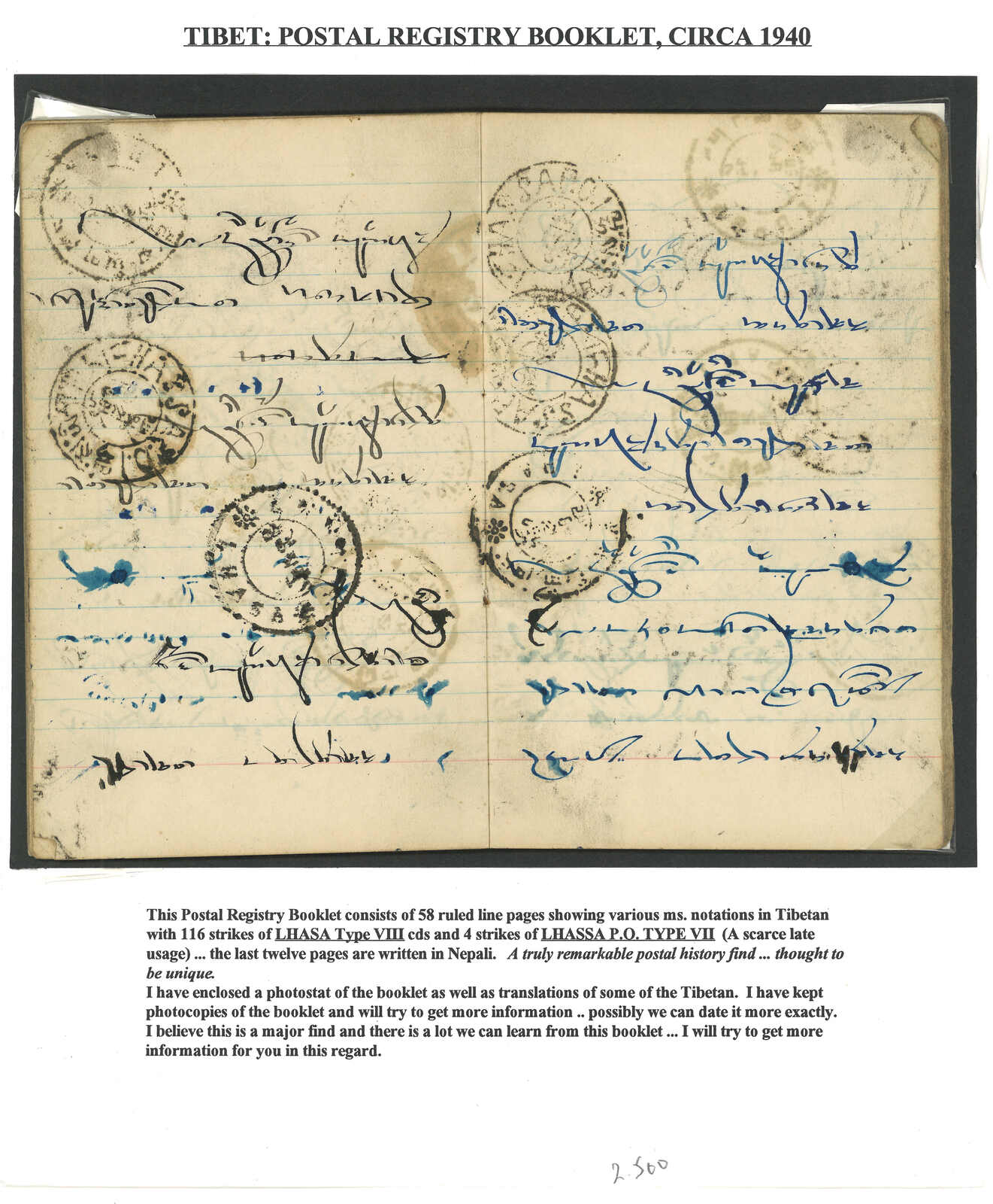 ca 1940 a postal registery booklet of Tibet local post, consisting 58 lines of Tibetan annotations and over 100 strikes of Lhasa h.s. The last few pages were written in Nepali. Remarkable piece of Tibetan postal history.