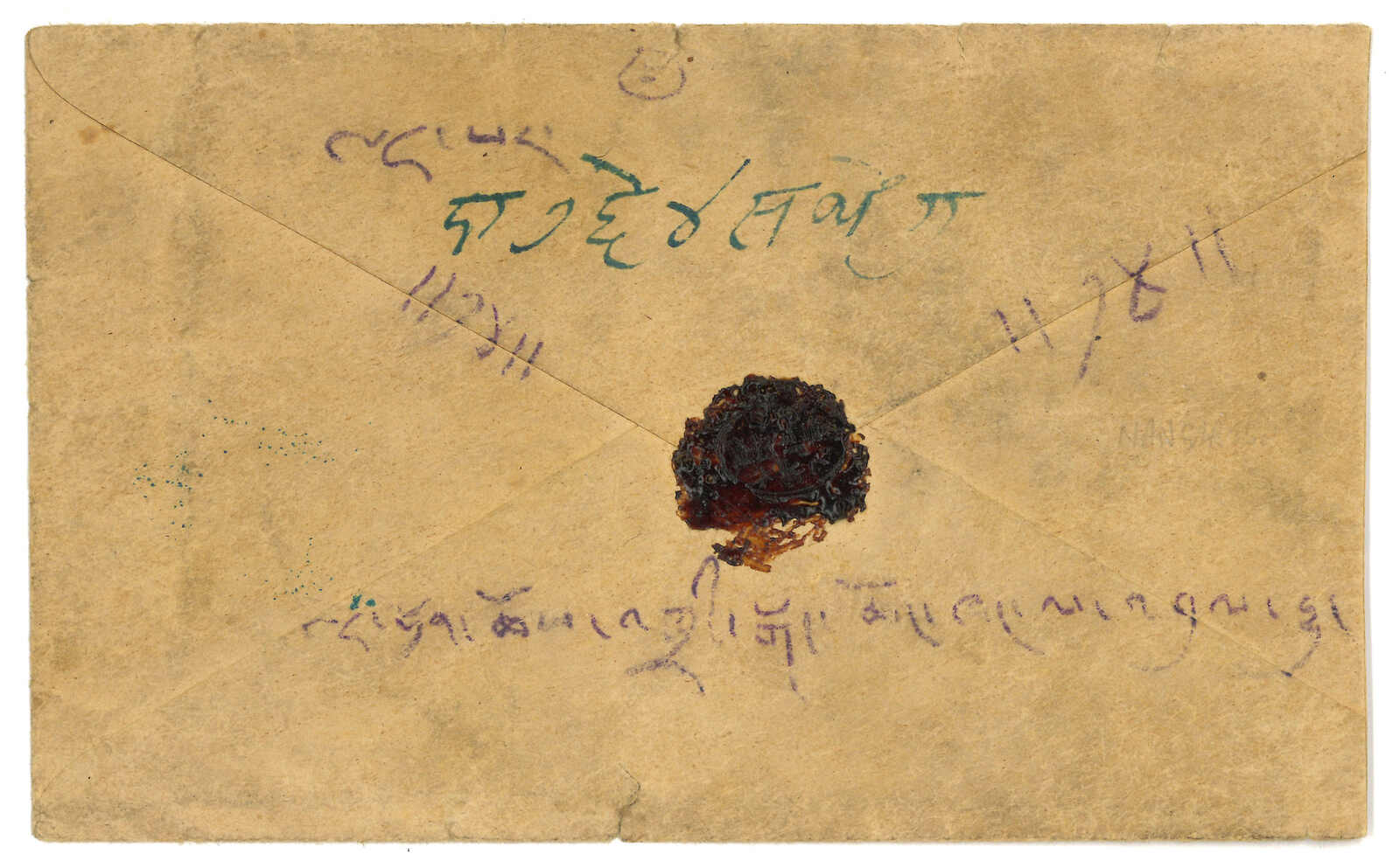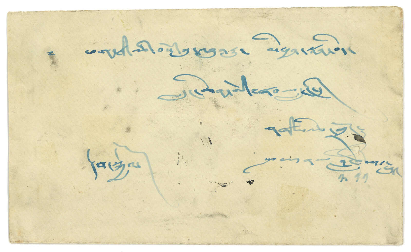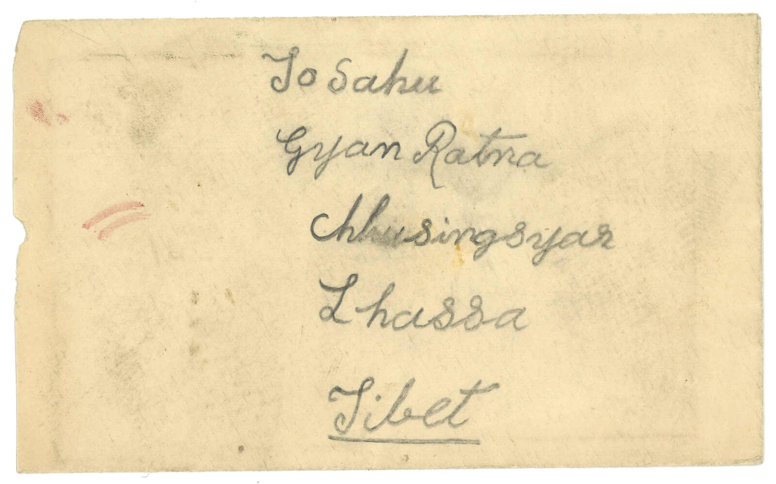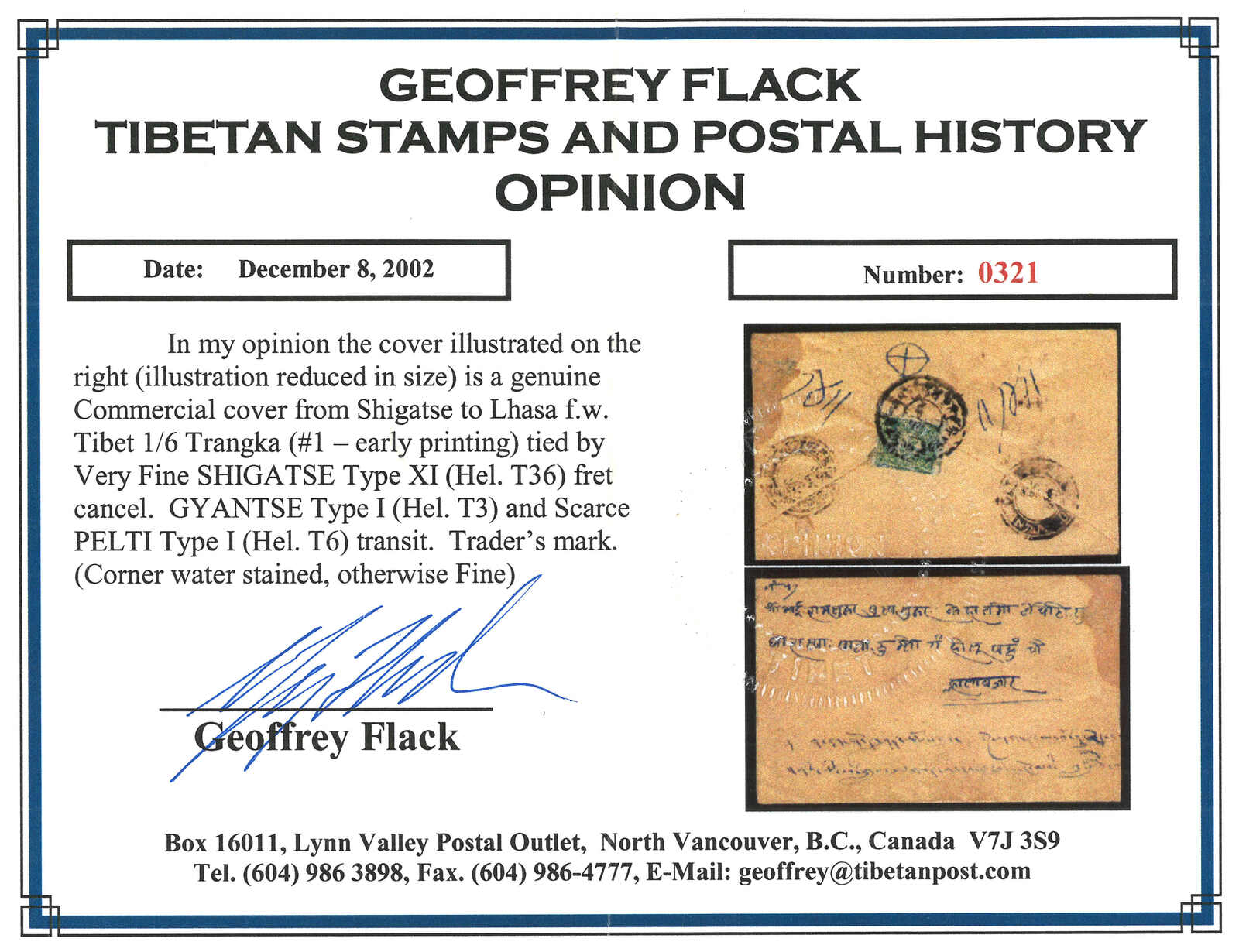 ca 1920s Shigatse to Lhasa, f.w. Tibet 1st issue 1/6tr on reverse, tied by Shigatse type 1 h.s. Transit Gyantse, Pelti. Pelti type 1 h.s. is especially scarce. With Geoffrey Flack certificate.