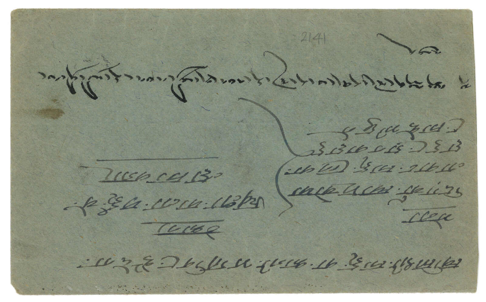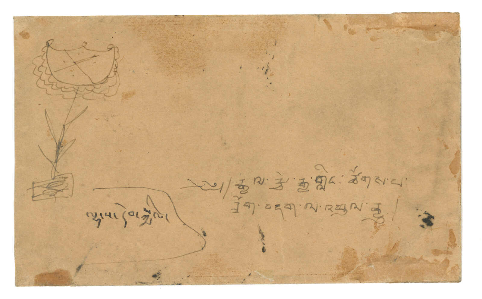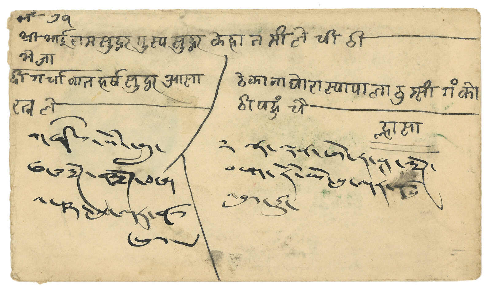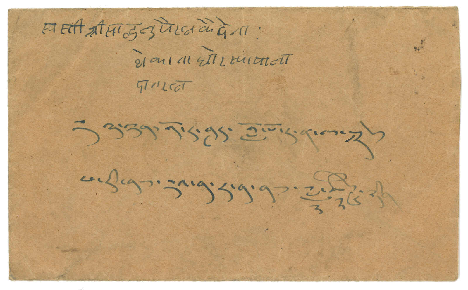 ca 1920s Shigatse to Lhasa, f.w. Tibet 1st issue 1/6tr on reverse, tied by Shigatse type 1 h.s. Transit Gyantse, Pelti. Pelti type 1 h.s. is especially scarce. With Geoffrey Flack certificate.