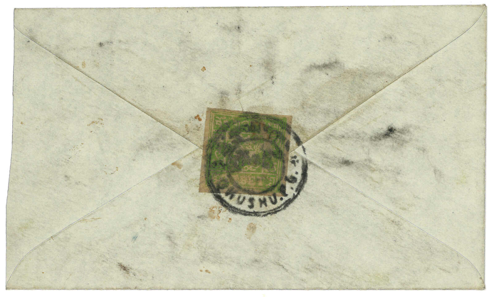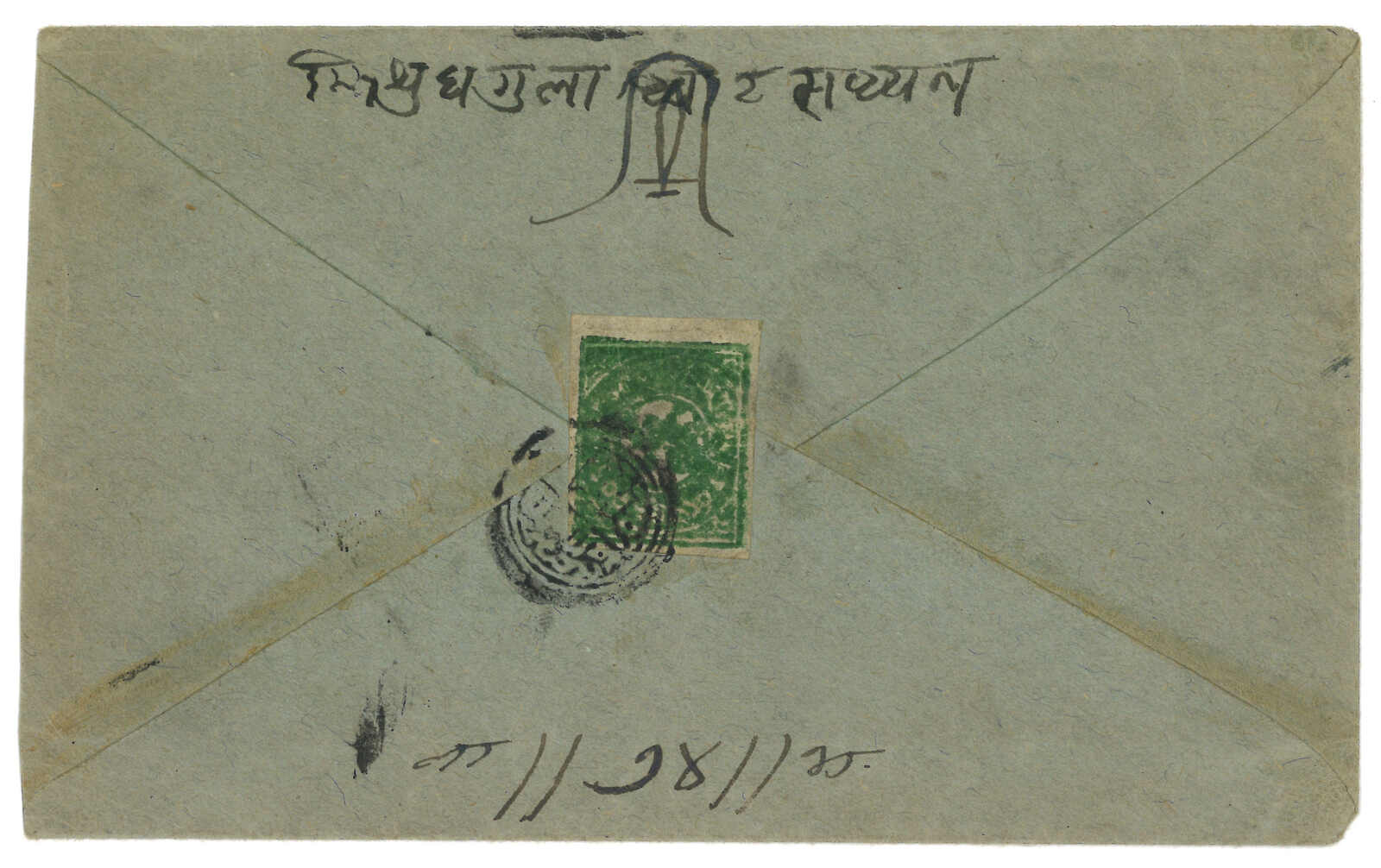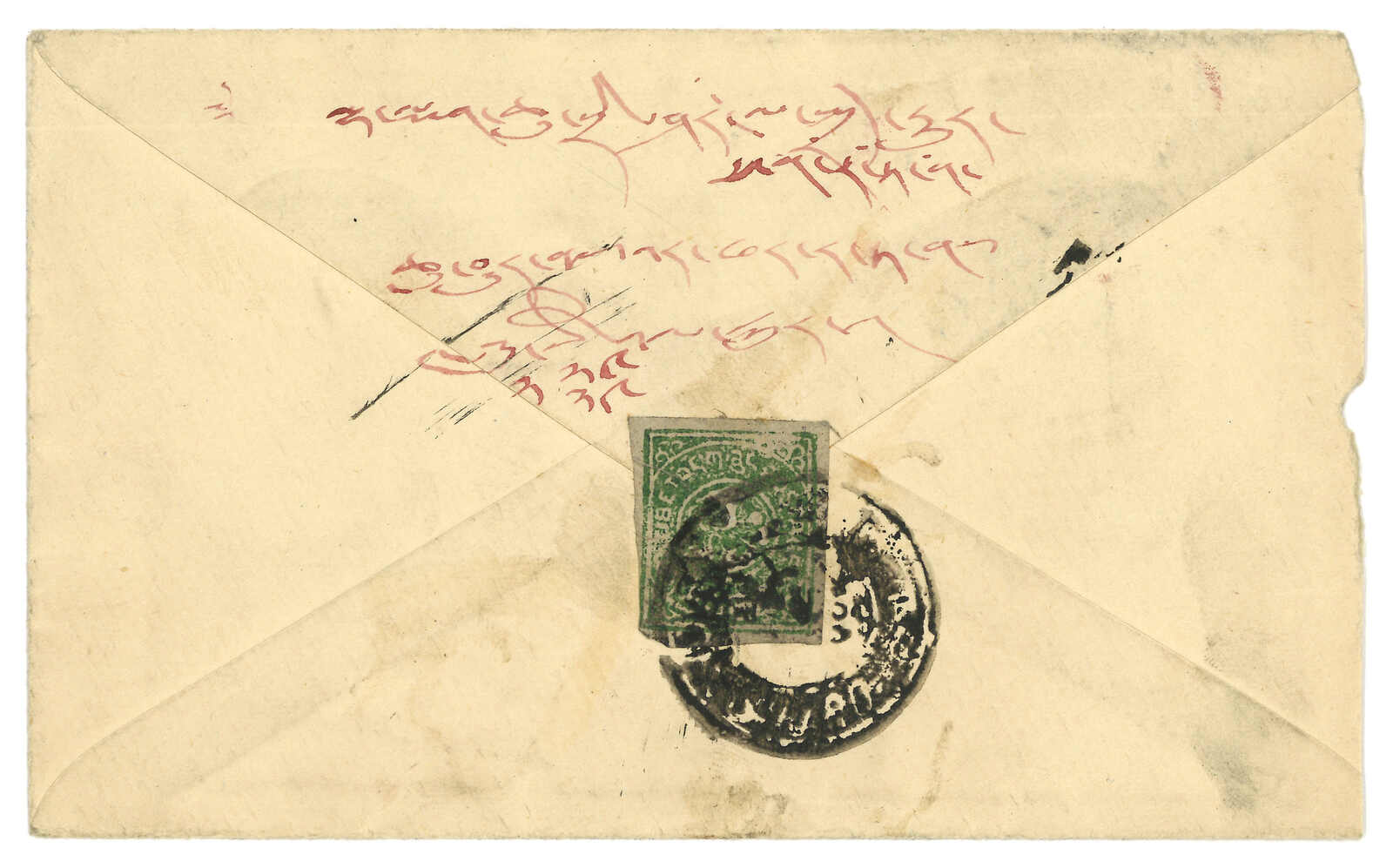 1914 Shigatse to Nepal, f.w. Tibet 1st issue 1/6tr on reverse, tied by extremely scarce Shigatse type I h.s. in blue-green. This type of h.s is much rarer in blue-green than in normal black.