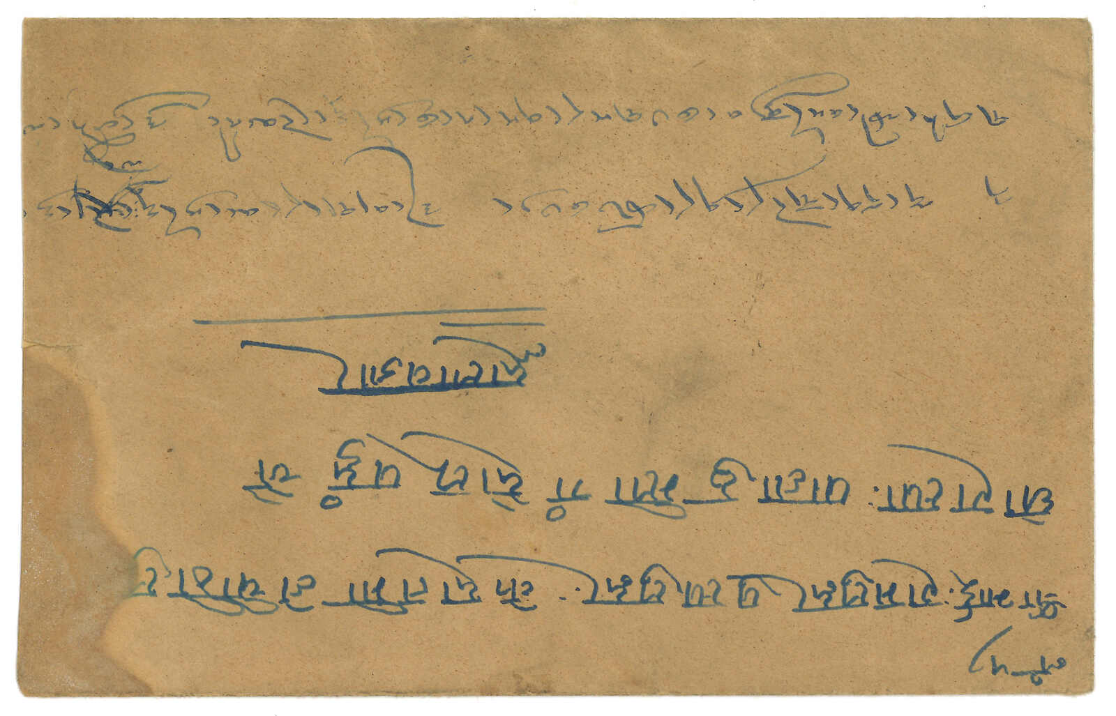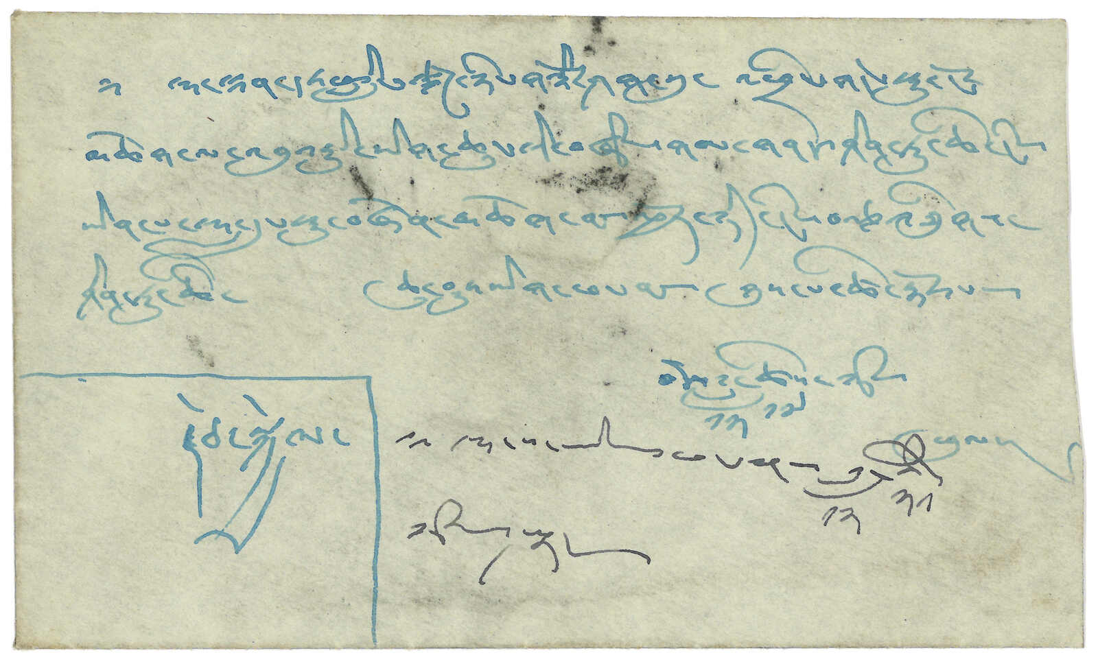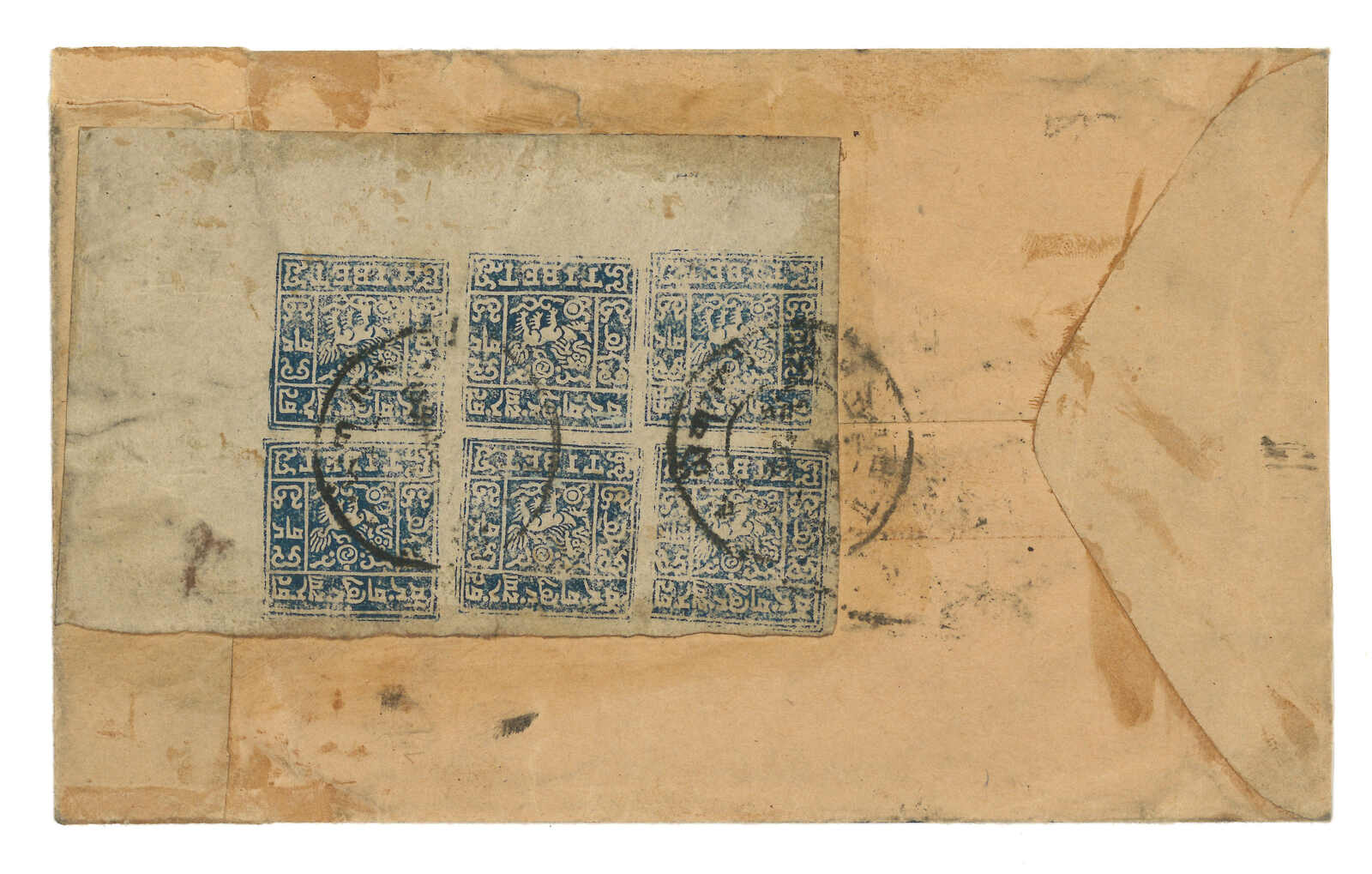 1914 Shigatse to Nepal, f.w. Tibet 1st issue 1/6tr on reverse, tied by extremely scarce Shigatse type I h.s. in blue-green. This type of h.s is much rarer in blue-green than in normal black.