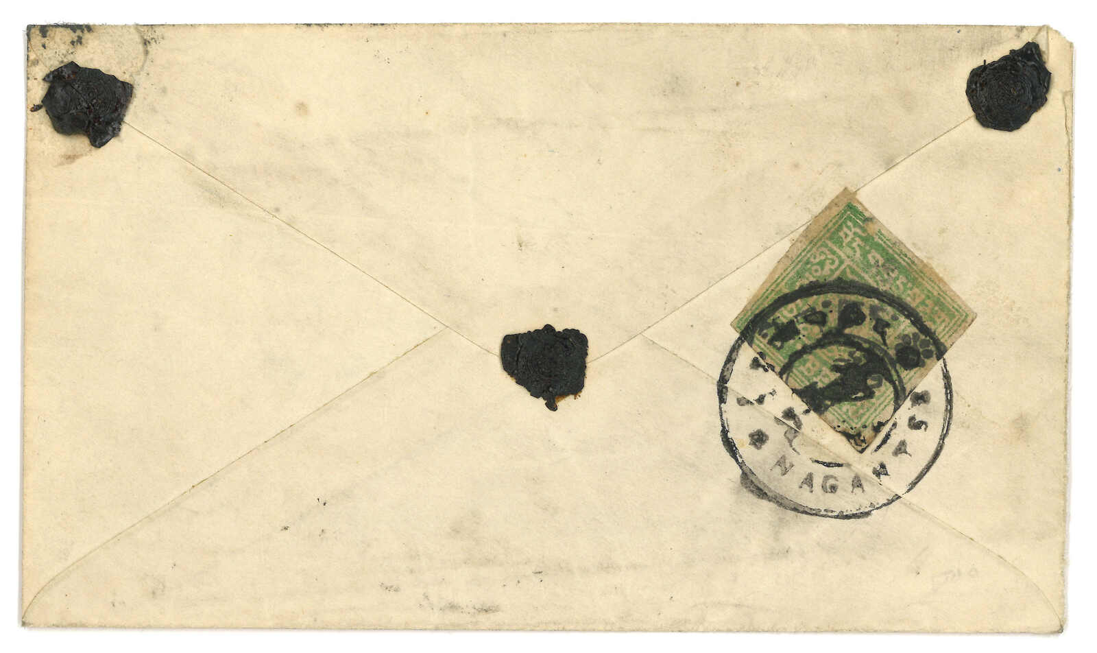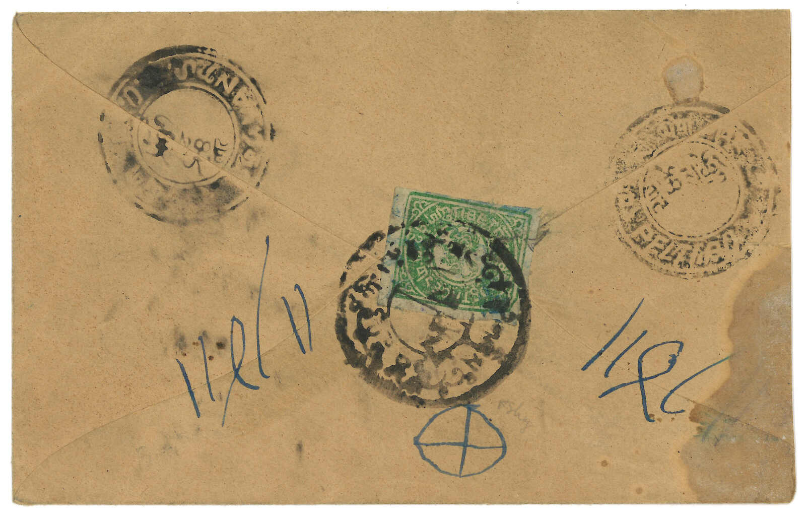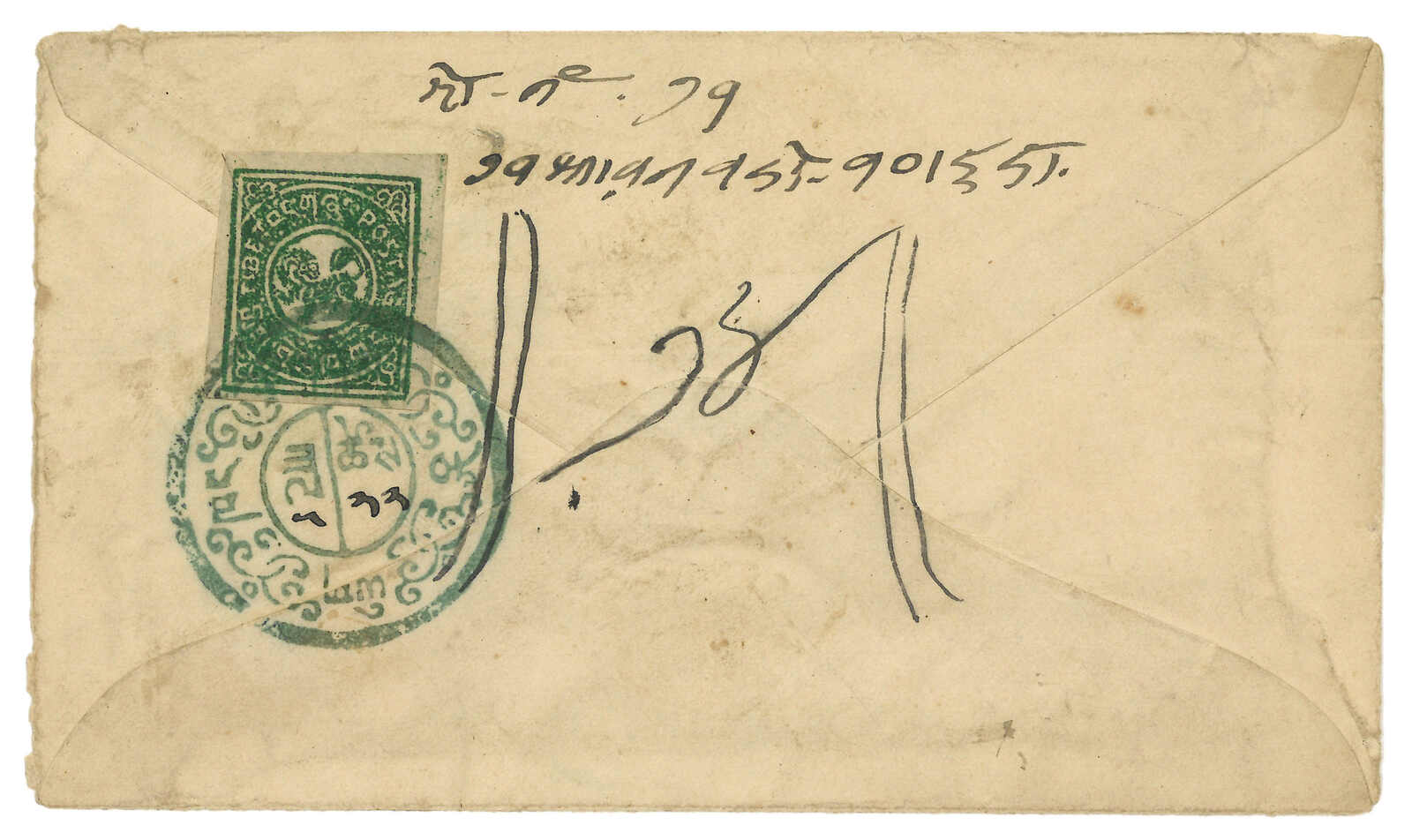 1914年日喀則寄尼泊爾,背貼西藏獅圖第一版1/6章噶,銷極罕之日喀則1型藍綠色圓戳。此戳之藍綠色例子遠比常見的黑色稀罕少見。(Image 1)