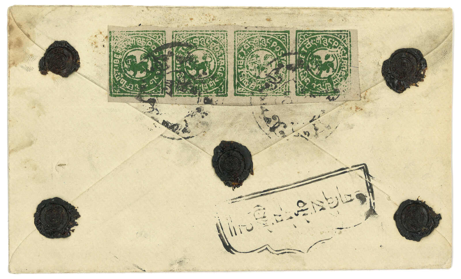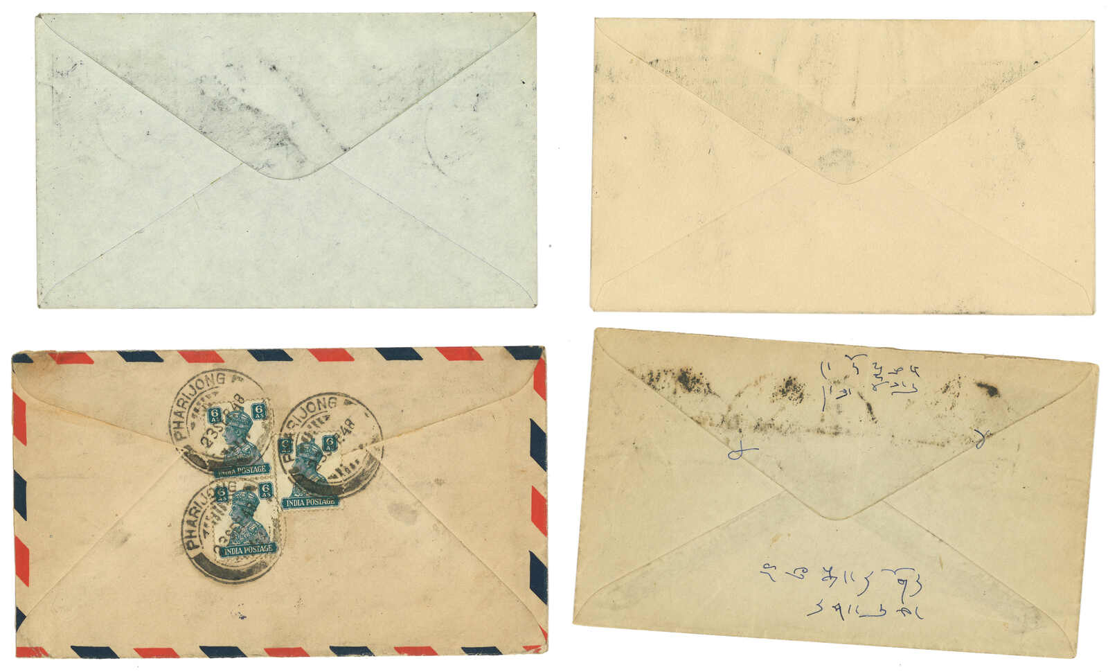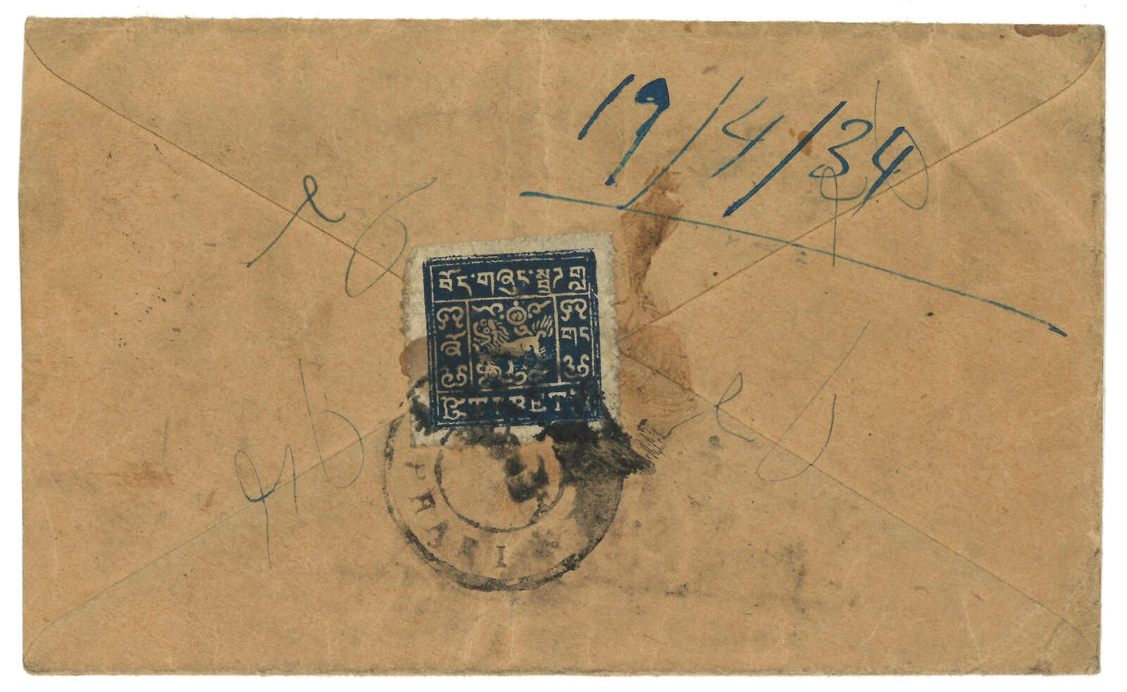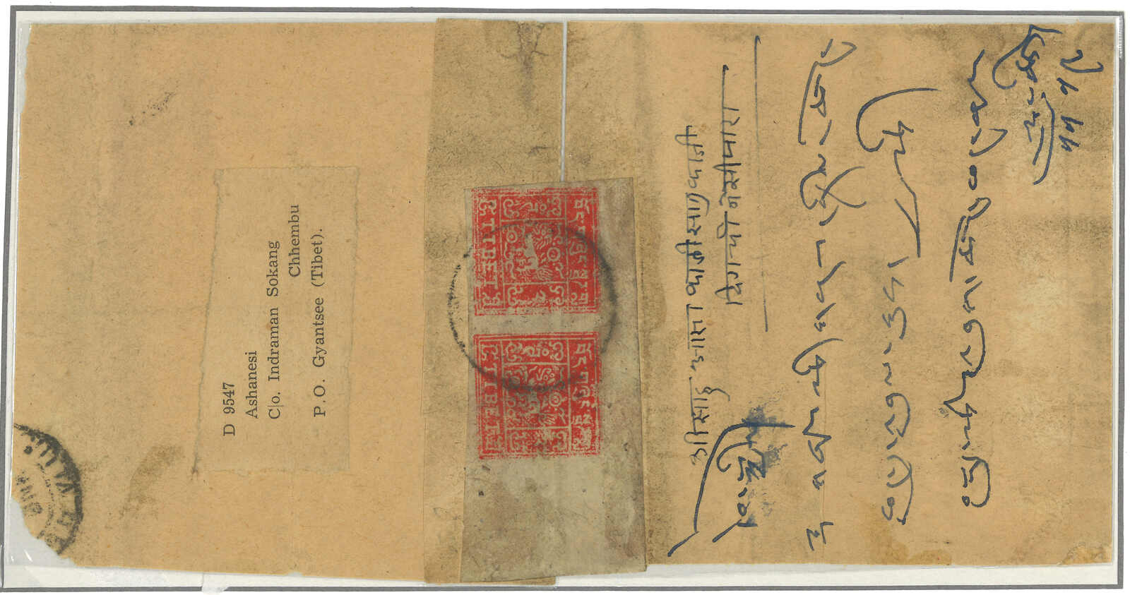 1930至1950年代掛號包裝封皮寄江孜,貼西藏獅圖第三版2章噶雙連,合4章噶掛號郵資,銷模糊戳記。很可能是西藏唯一之掛號包裝封皮例子。西藏郵戳大多沒有日期,相關文獻亦從缺,掛號郵資之調資仍有待探索。(Image 1)