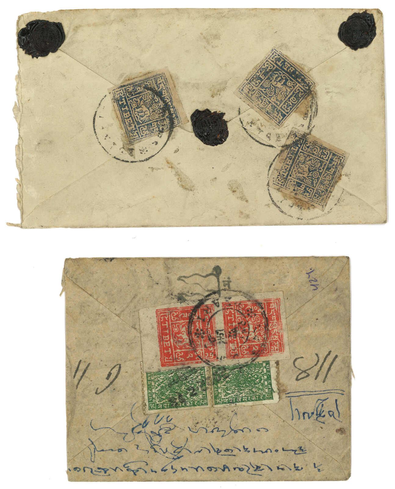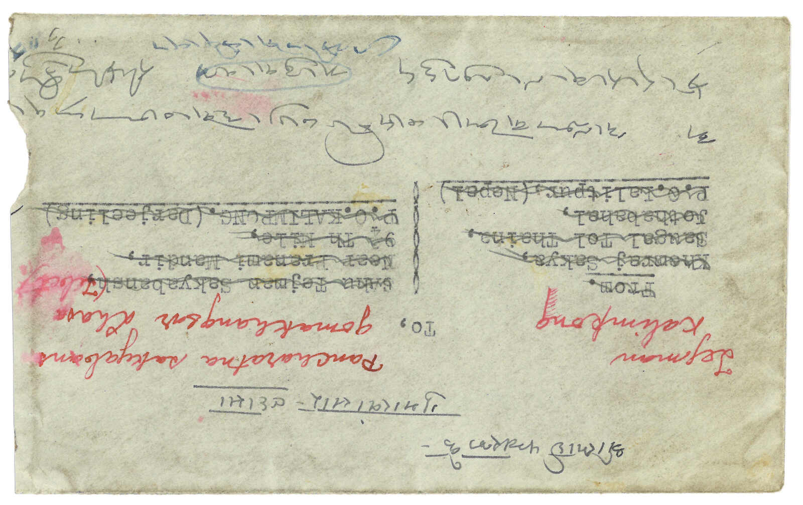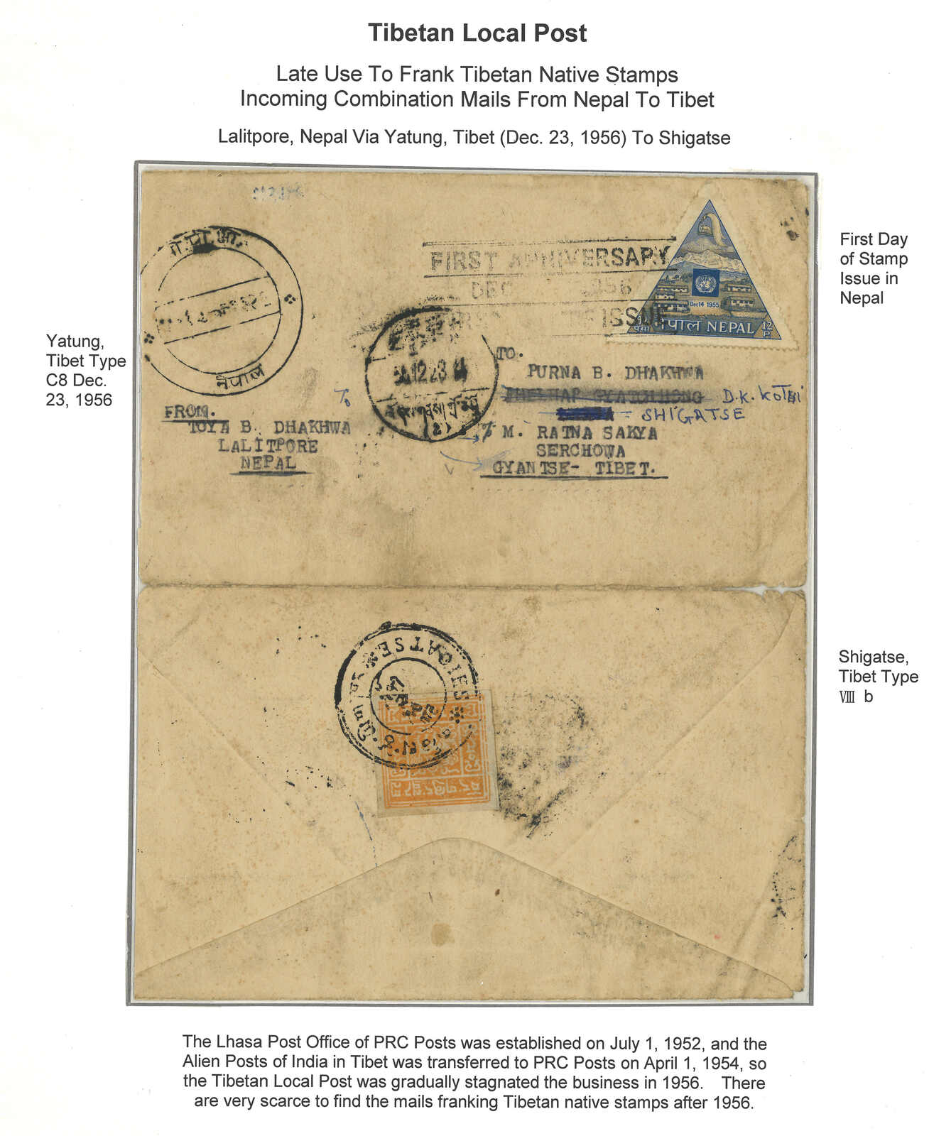 1956年尼泊爾寄日喀則,貼尼泊爾加入聯合國一週年紀念票,銷紀念戳。12.23經亞東。加貼西藏獅圖第三版2章噶,銷日喀則2型戳記。西藏地方郵政之較晚例子。(Image 1)