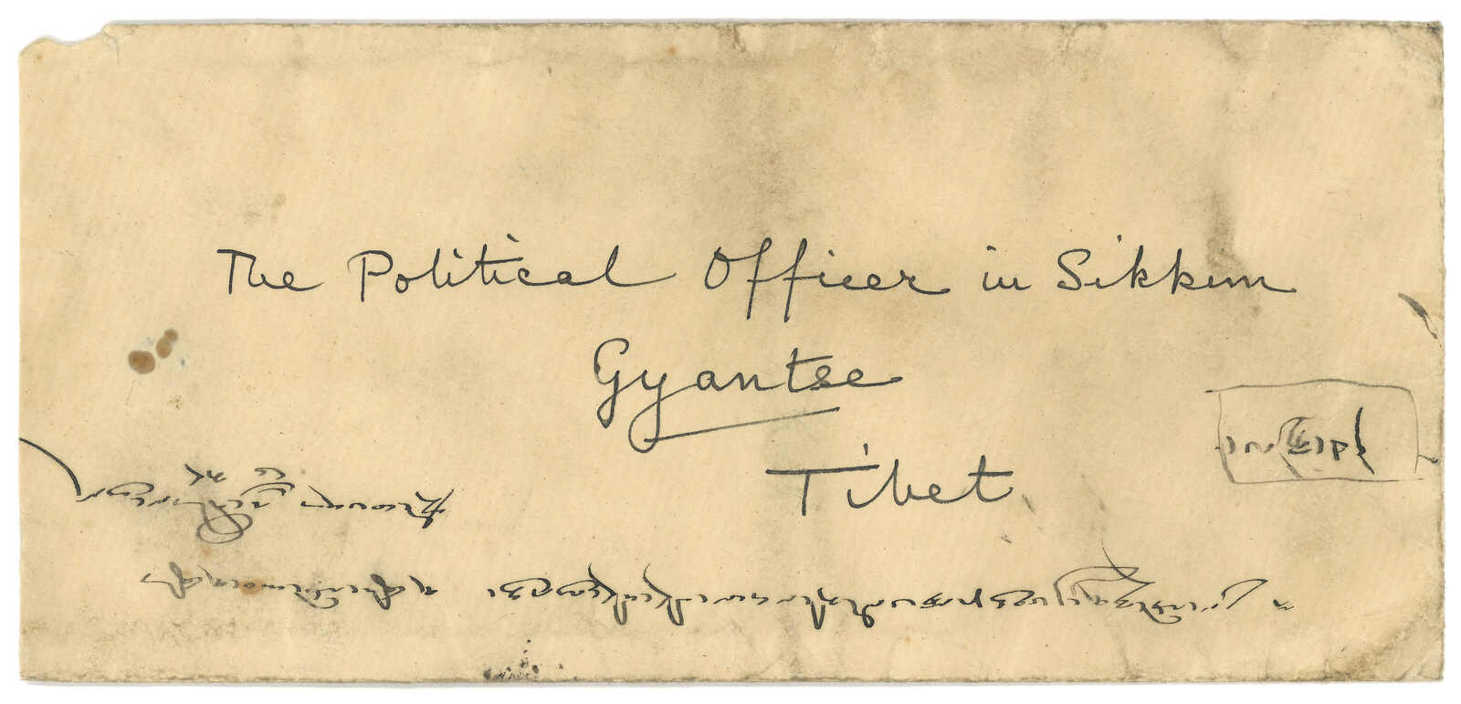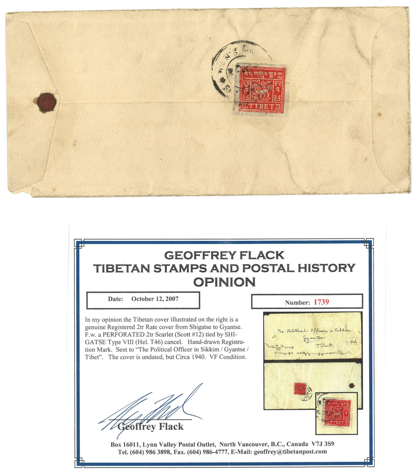 ca 1940 Shigatse to Political Officer in Sikkim, Gyantse, f.w. Tibet 3rd issue perforated 2tr on reverse, tied by Shigatse h.s., alongside with handdrawn registered mark. With Geofffrey Flack certificate.