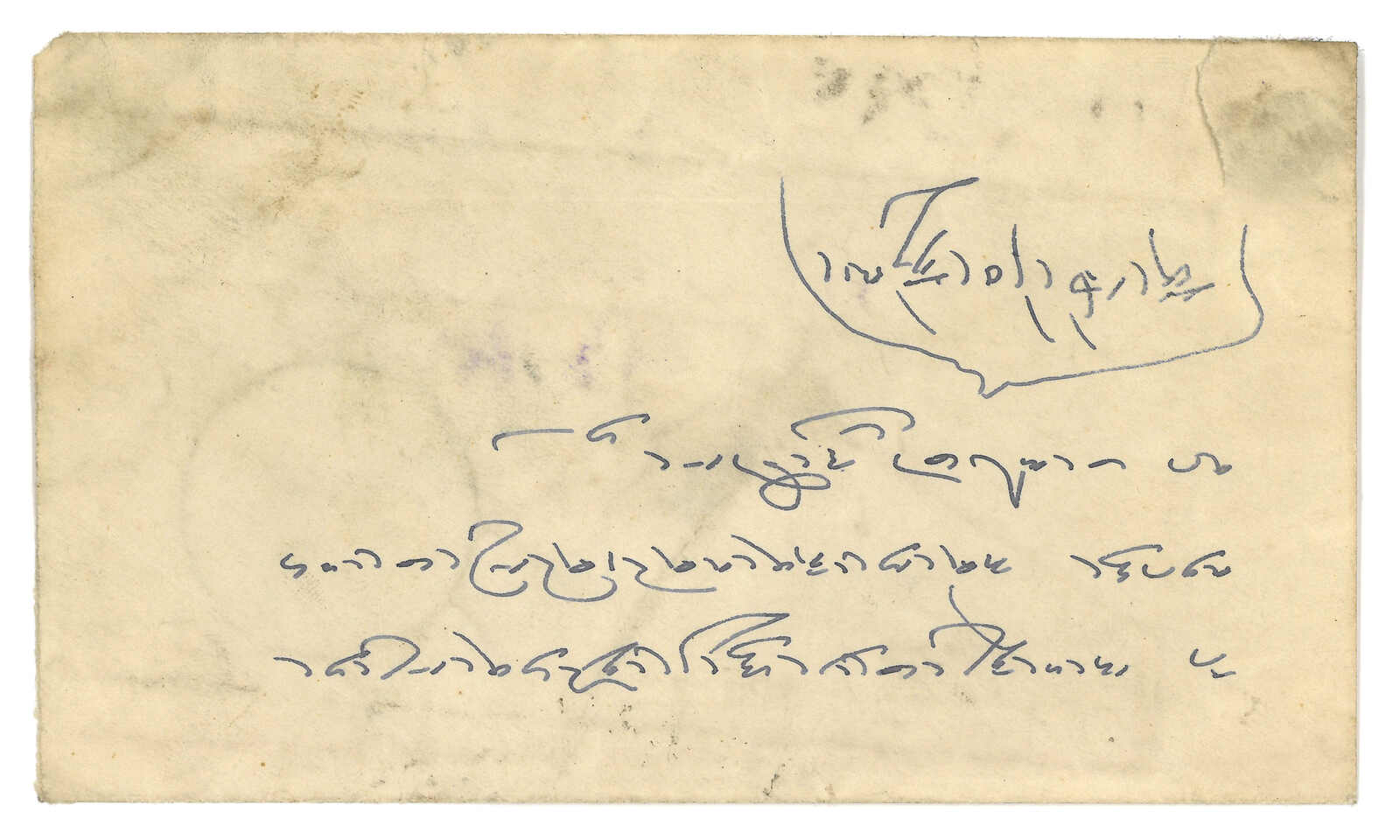ca 1920s Cover from Shigatse, f.w. Tibet 1st issue 1/6tr enamel green on reverse, tied by extremely scarce Shigatse post official seal.