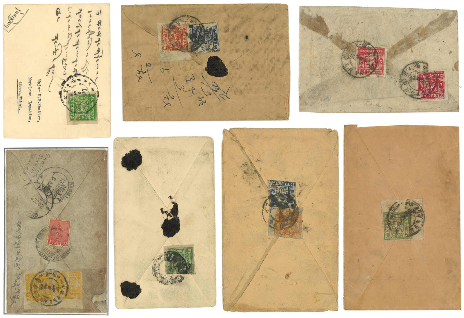 約1930至1950年代一組約16件西藏寄本地及國外封,均貼西藏獅圖第三版,展示了不同郵資及郵戳,包含較少見之浪子卡戳記。適合郵資研究。(Image 1)