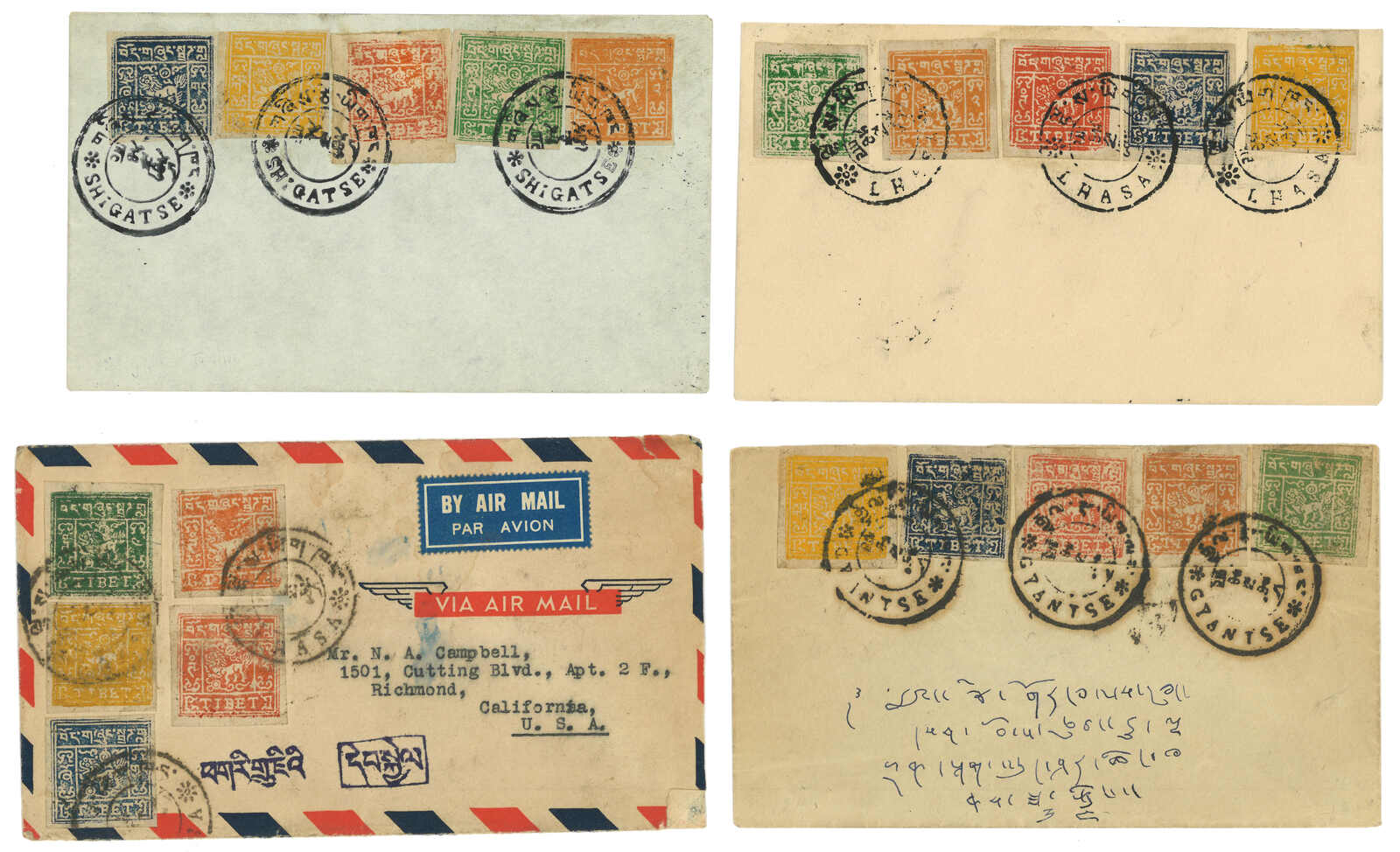 A group of 4 philatelic covers f.w. Tibet 3rd issue complete set, tied by Lhasa, Shigatse and Gyantse type 2 h.s.