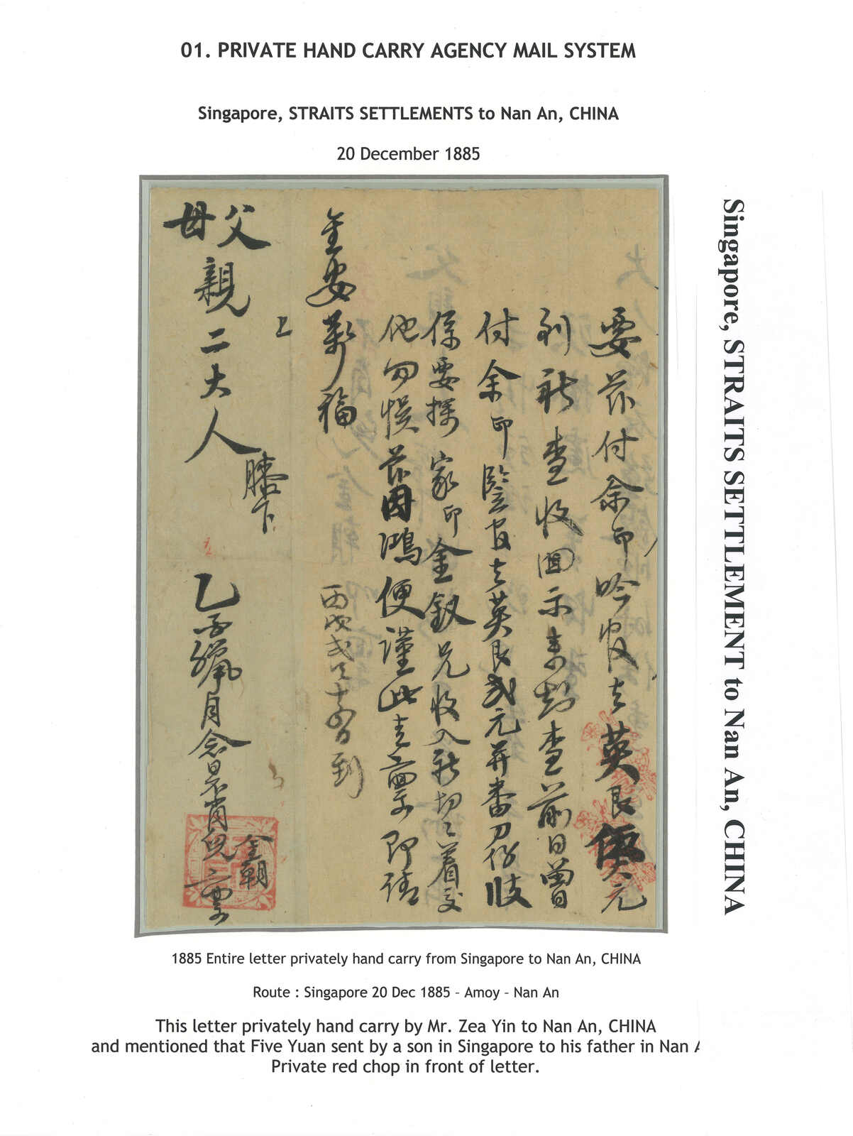 1885 (20 Dec) Qiaopi from Singapore to Nanan, sent by courier, applied with red square seal. The content was about sending 5 dollars. Scarce early Qiaopi from Singapore.