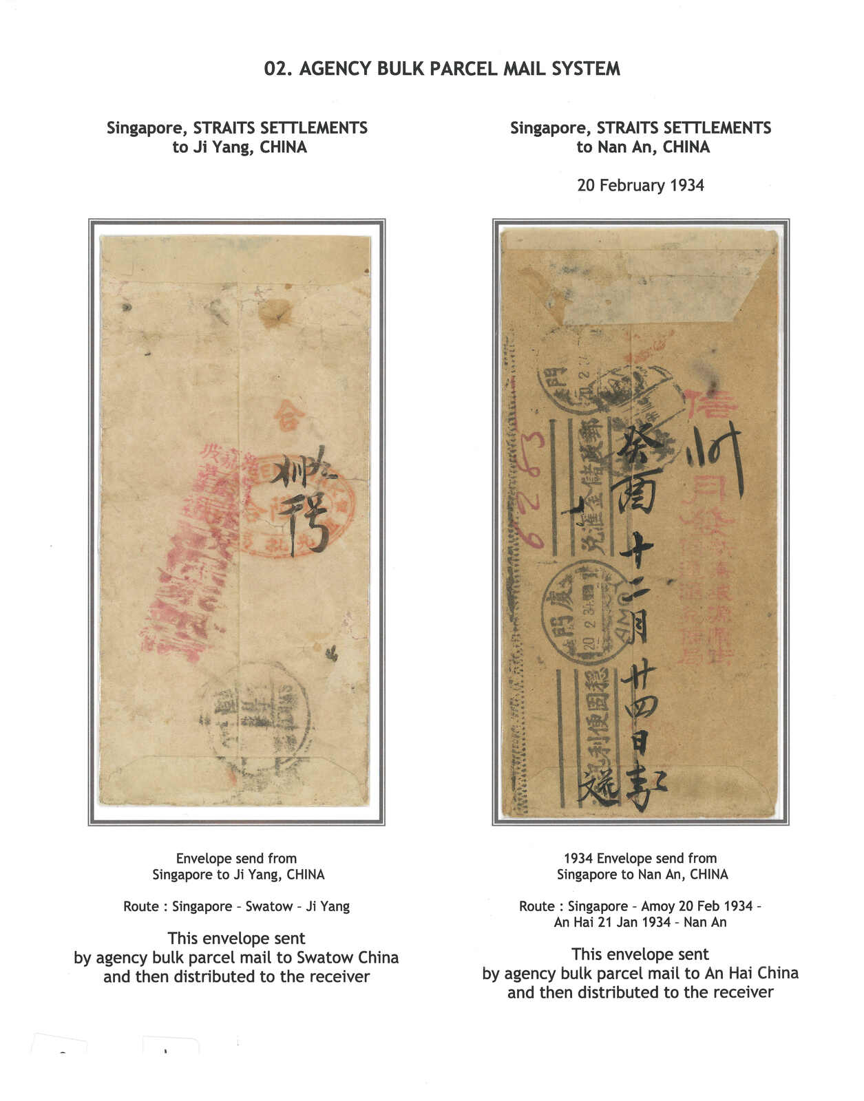 1930s a pair of Qiaopi (money remittance letter) from Singapore to Nanan and Tsinkiang, applied with multiple oval and vertical Qiaopiju h.s. Arrived Amoy and Swatow with cds. Both frankless and delivered in bulk mail.