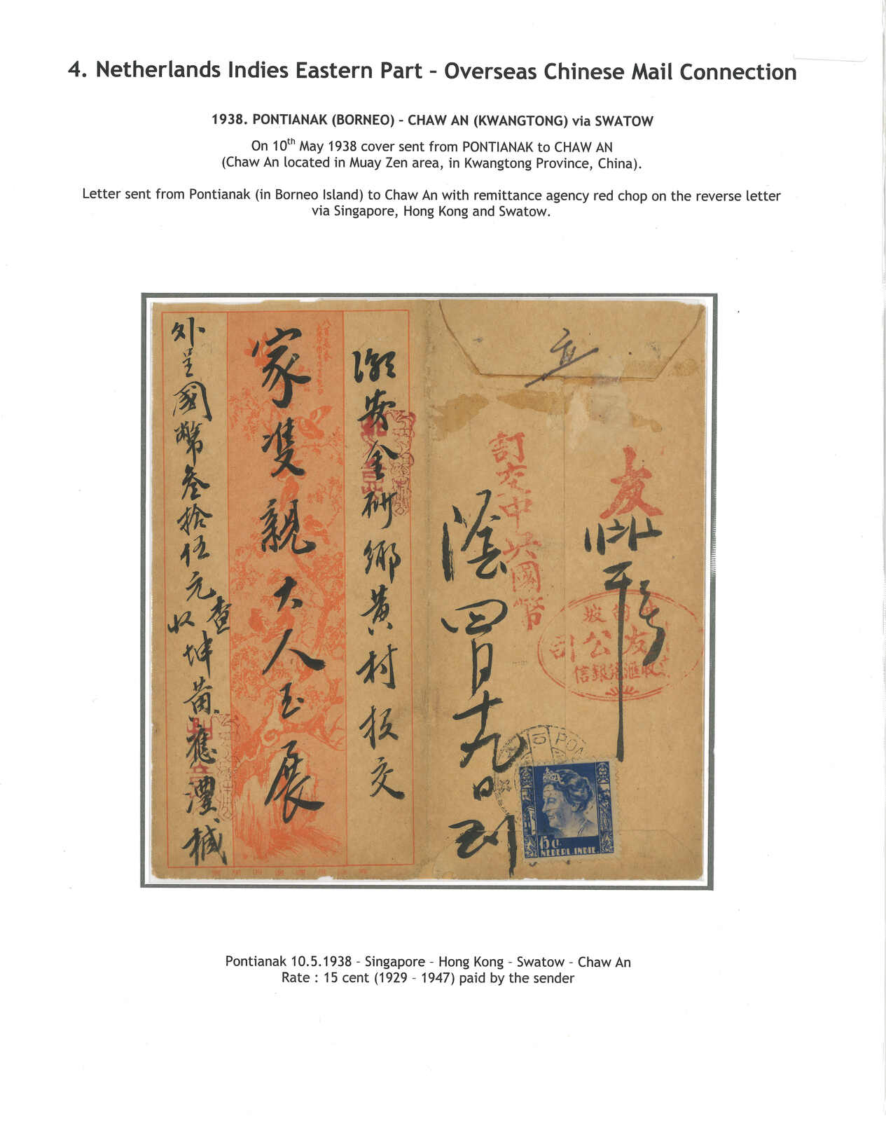 1938 (10 May) Qiaopi (money remittance letter) red band cover from Pontianak to Chowan, f.w. Dutch East Indies 15c on reverse, tied by Pontianak cds., alongside with Qiaopiju oval seal. Cover opened out for display.