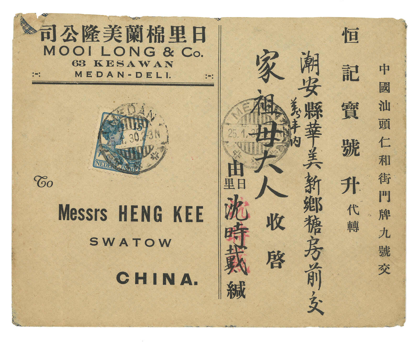 1930 (25 Jan) Pre-printed remittance cover of Mooi Long & Co., Medan, to Swatow, f.w. Dutch East Indies 15c, tied by Medan cds. Remittance amount was not showed on the cover. On reverse with circular Mooi Long & Co.