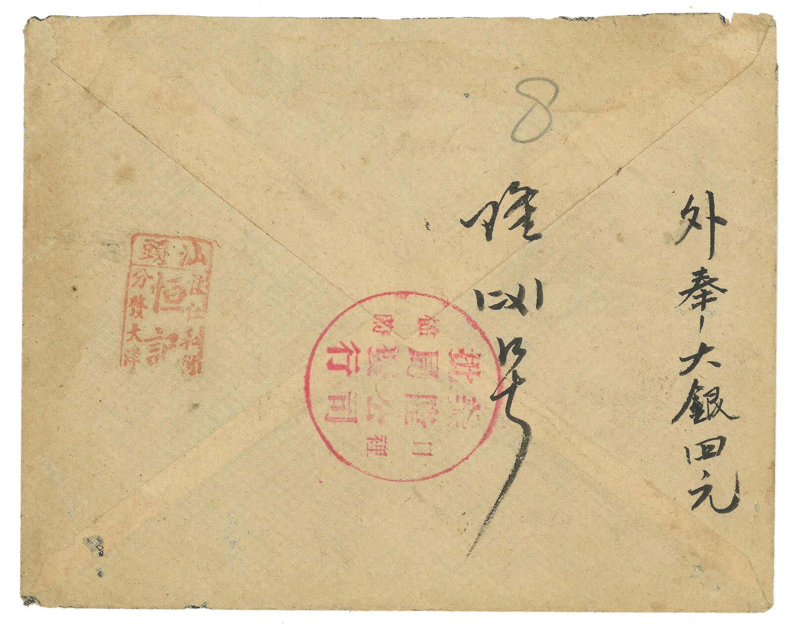 1934 Palopo, Dutch East Indies to Kaiping. Double-registered cover stated containing 30 Gulden, f.w. Dutch East Indies 60c + 15c, tied by Palopo cds, alongside with Qiaopiju oval seal. On reverse with Makassar weight marking.