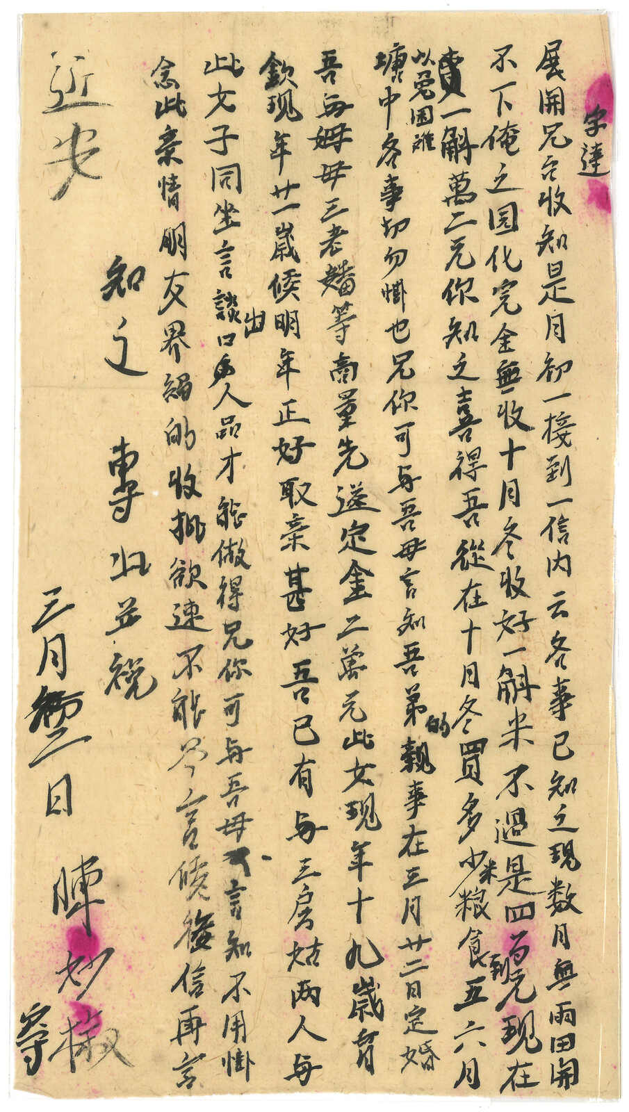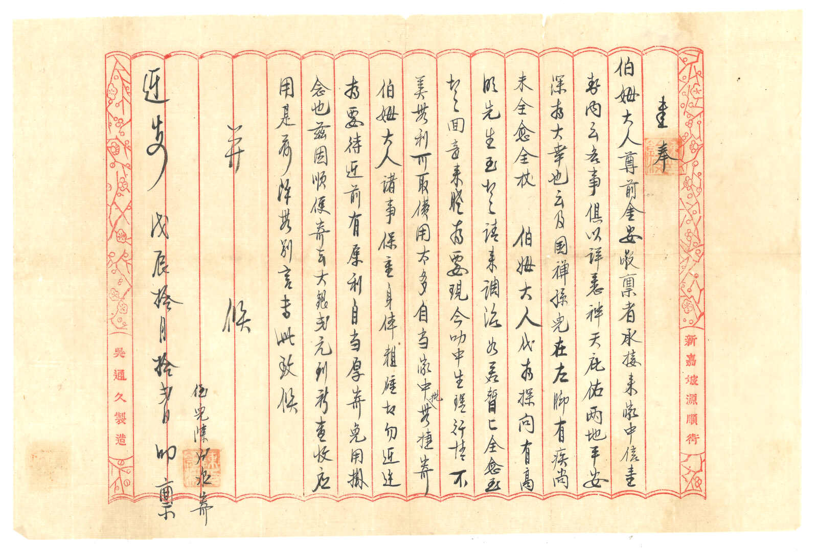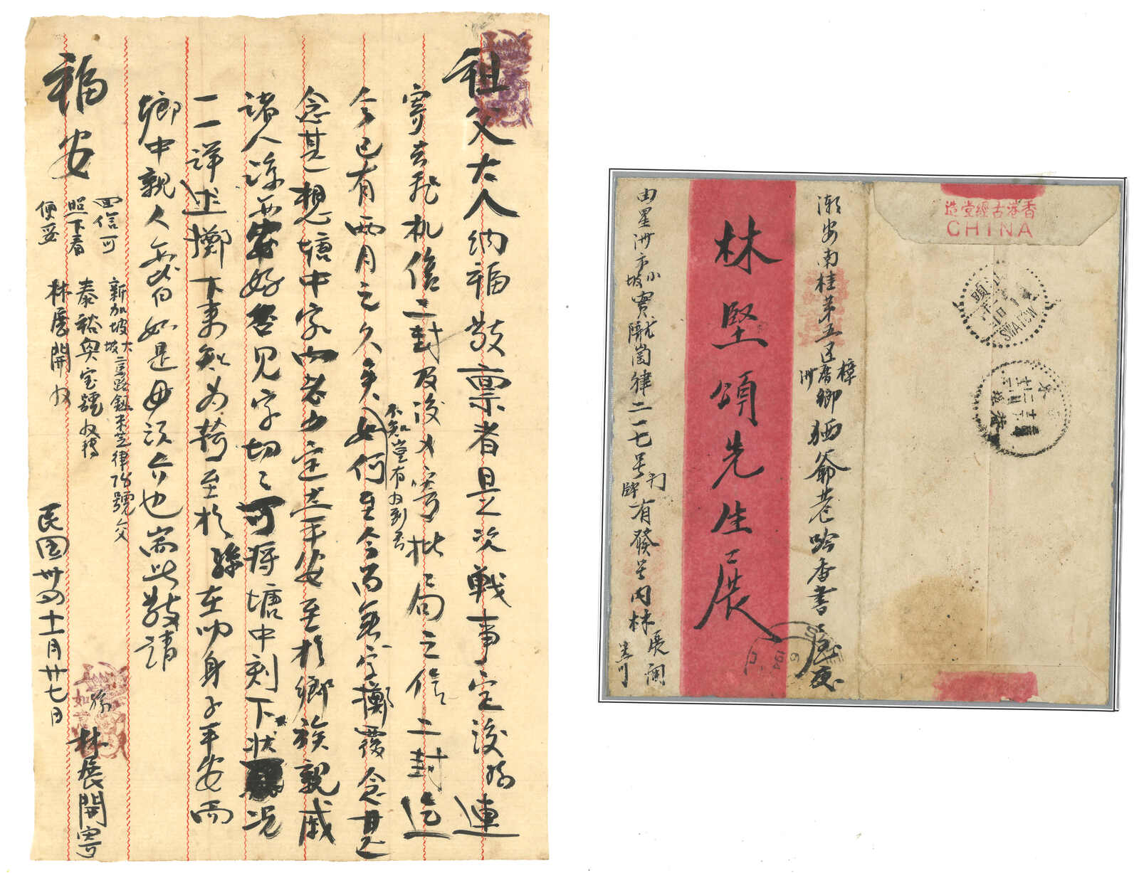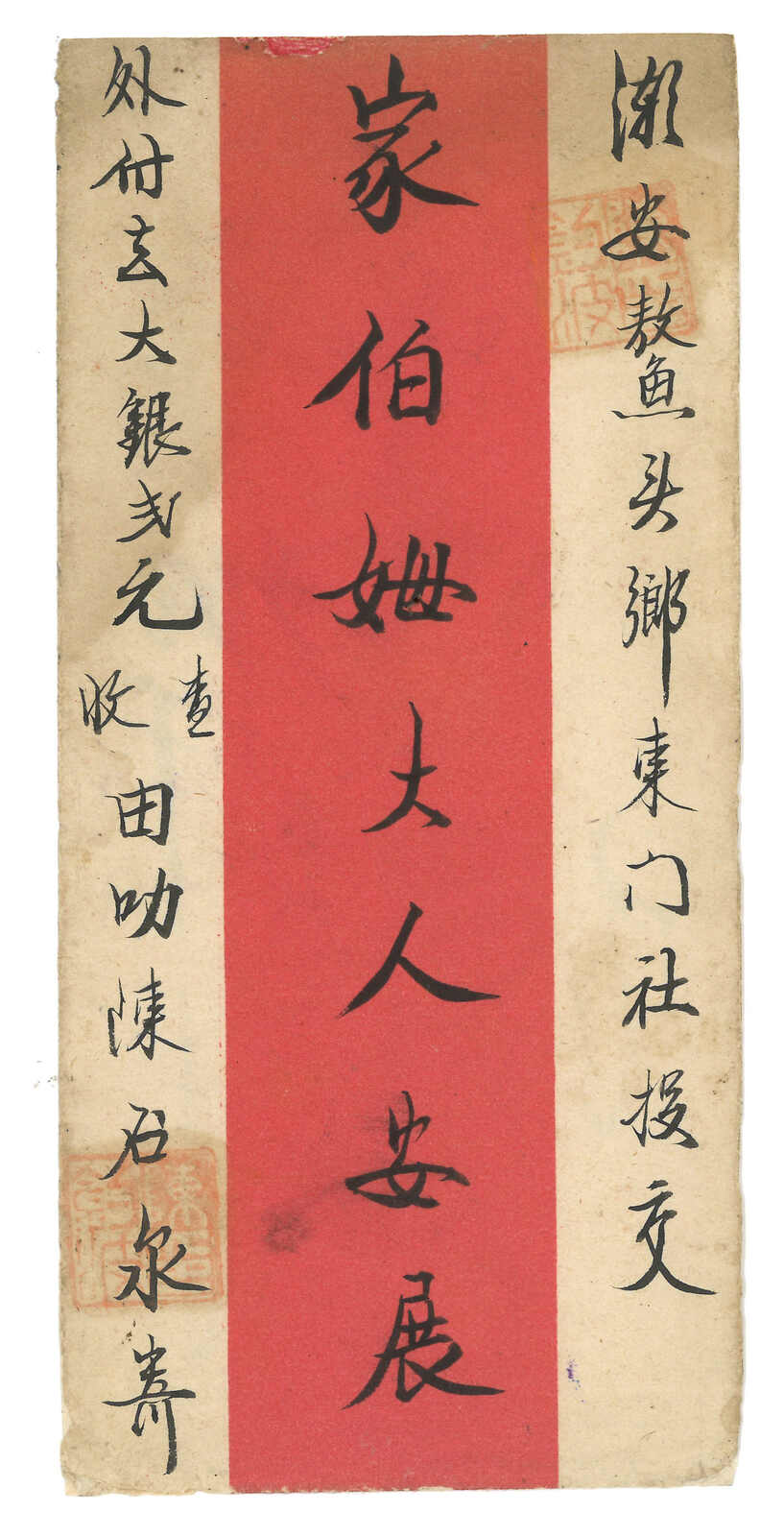 新加坡寄南安僑批,由水客送遞,鈐紅色方戳。內容為匯款五元。稀罕難得之寄新加坡早期僑批。(Image 1)