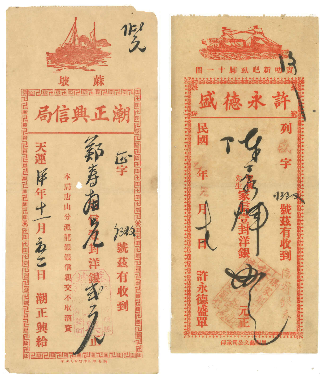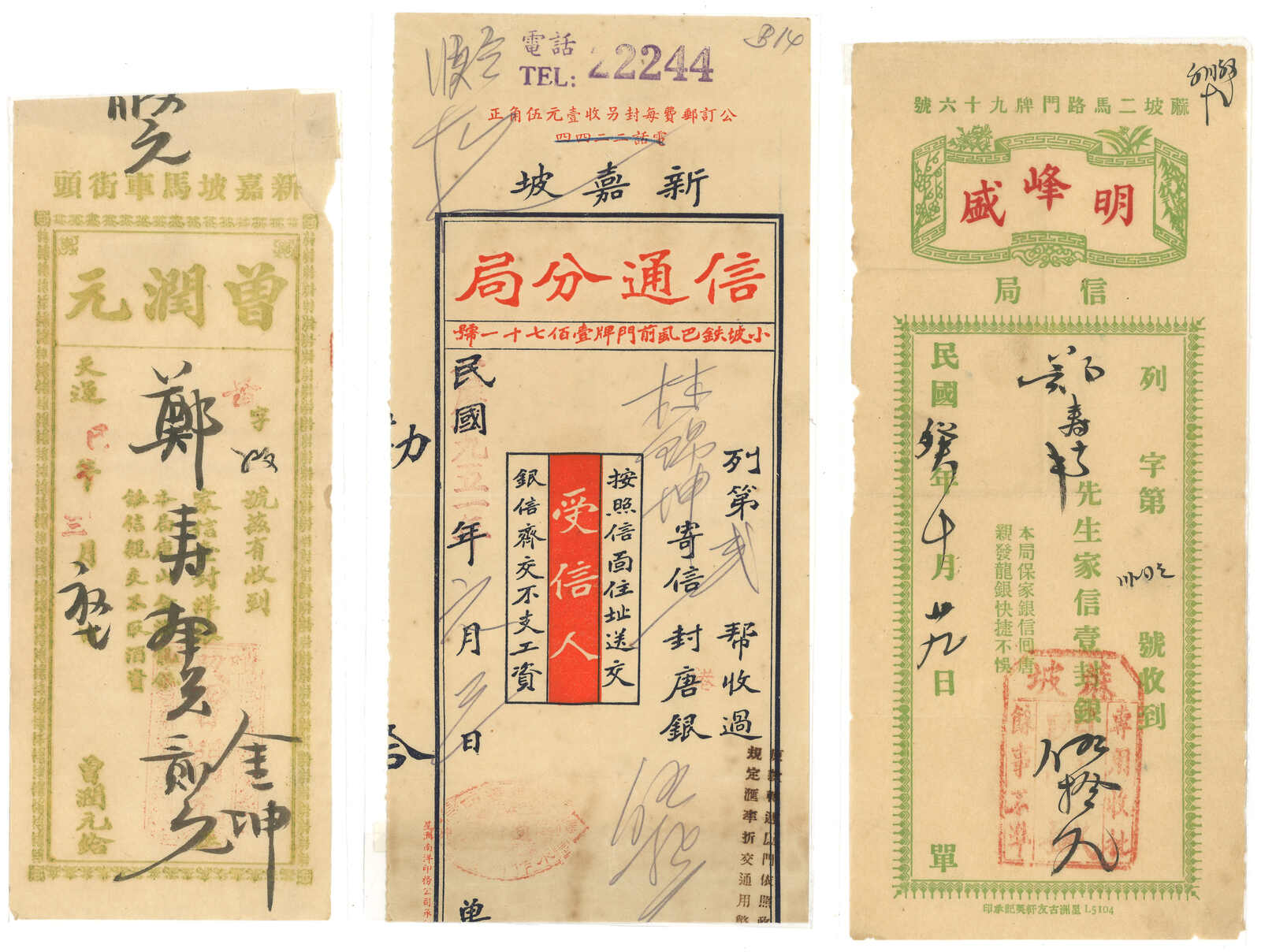 A group of 5 remittance slips of Singapore Qiaopiju, showcasing different names and seals of the Qiaopiju. After WWII, Singapore government reinforced management and regulation of the remittance industry.
