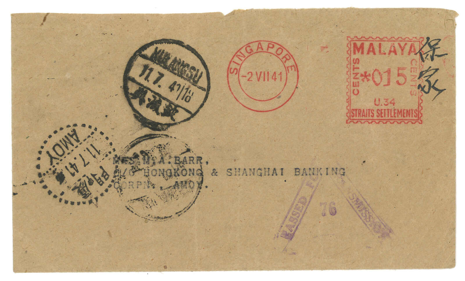1941 HSBC, Singapore (2 Jul) to HSBC, Amoy, applied with Singapore / Malaya 15c meter stamp, alongside with triangular censor mark. Arrived Amoy and Kulangsu (11 Jul). Usage of meter stamp is rather scarce.