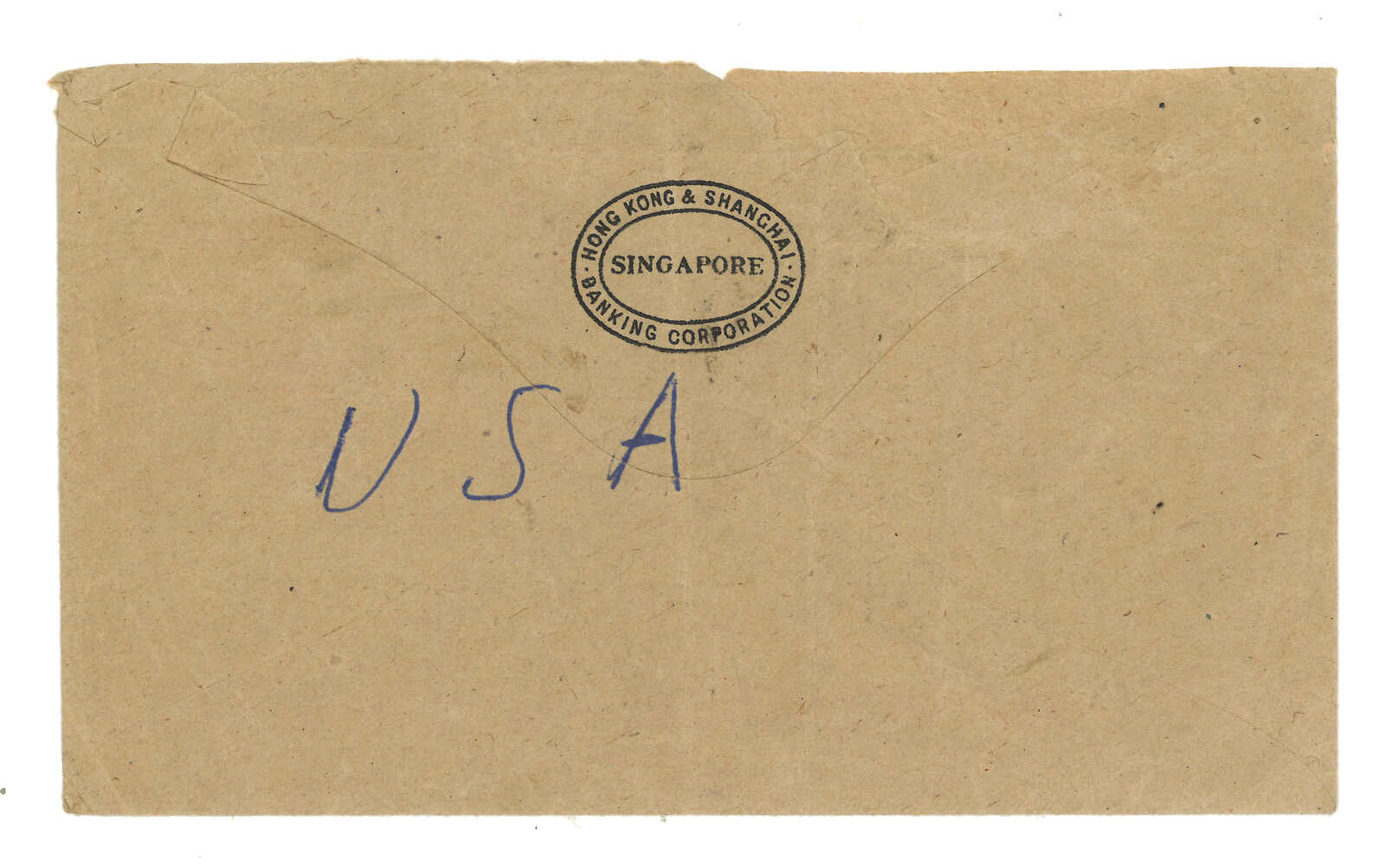 匯豐銀行新加坡分行寄廈門分行,鈐新加坡/馬來亞15分機戳,旁鈐三角形檢查章。7.11抵廈門及鼓浪嶼。鈐機戳者較少見。(Image 1)