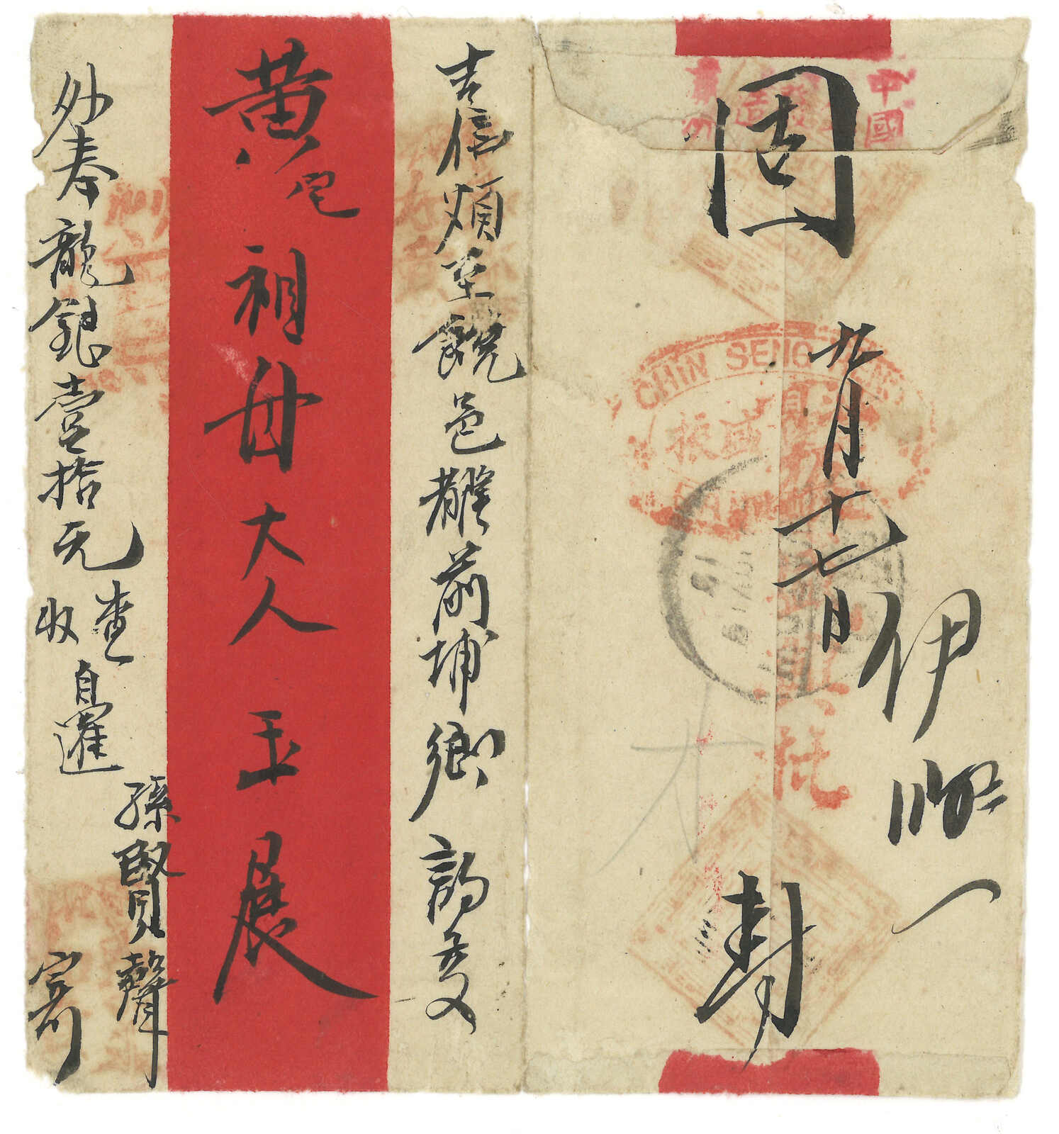 1919年僑批紅條封自曼谷寄汕頭,鈐振盛興批局橢圓戳及直戳。11月抵汕頭。由於這類型僑批以總包寄中國,故無暹羅郵戳。封剖開以作展示。(Image 1)