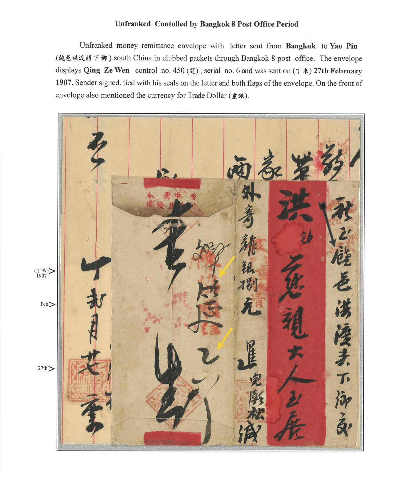 1907 (27 Feb) Qiaopi (money remittance letter) from Bangkok to Jaoping, applied with Qiaopiju vertical seal, "Cash" h.s. in Chinese and serial number manuscript. As this type of Qiaopi were sent to China in bulk, no postmark of