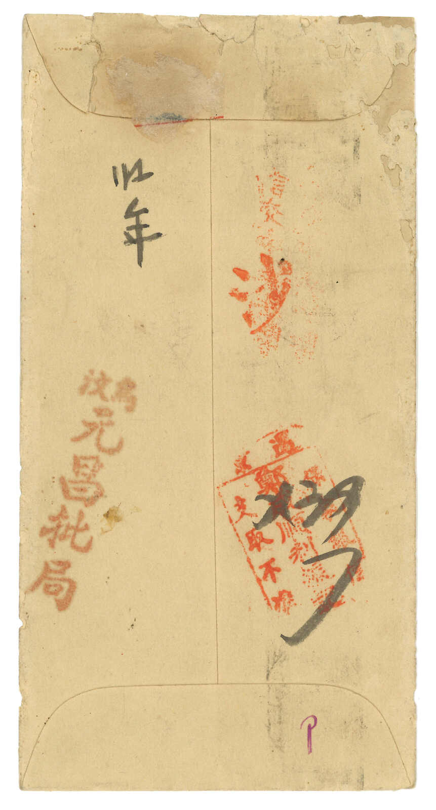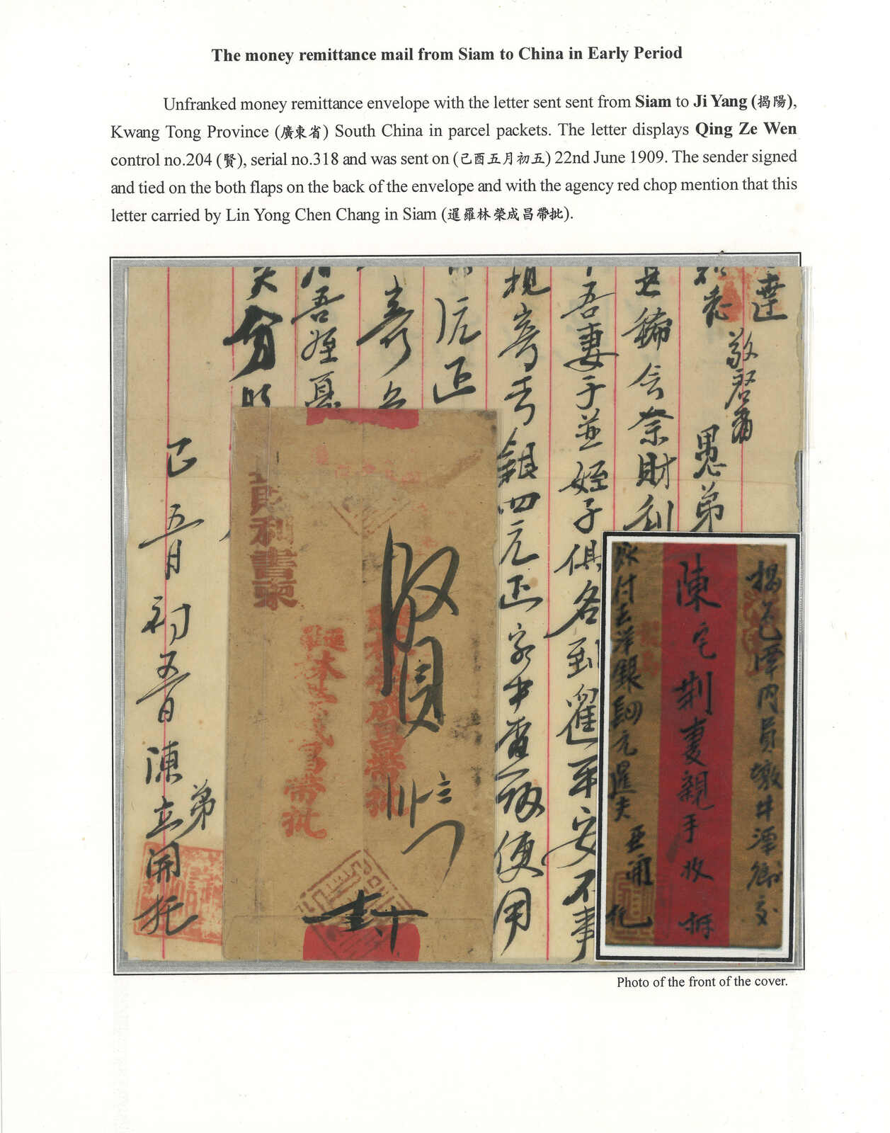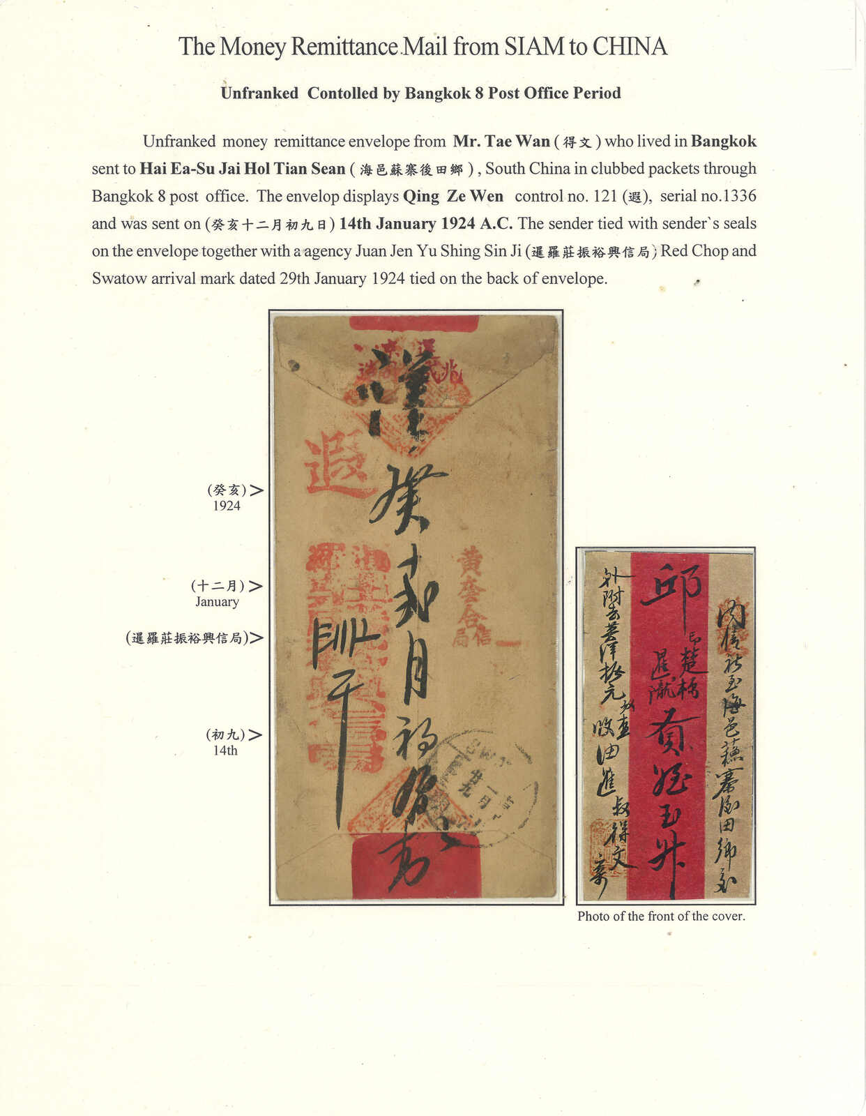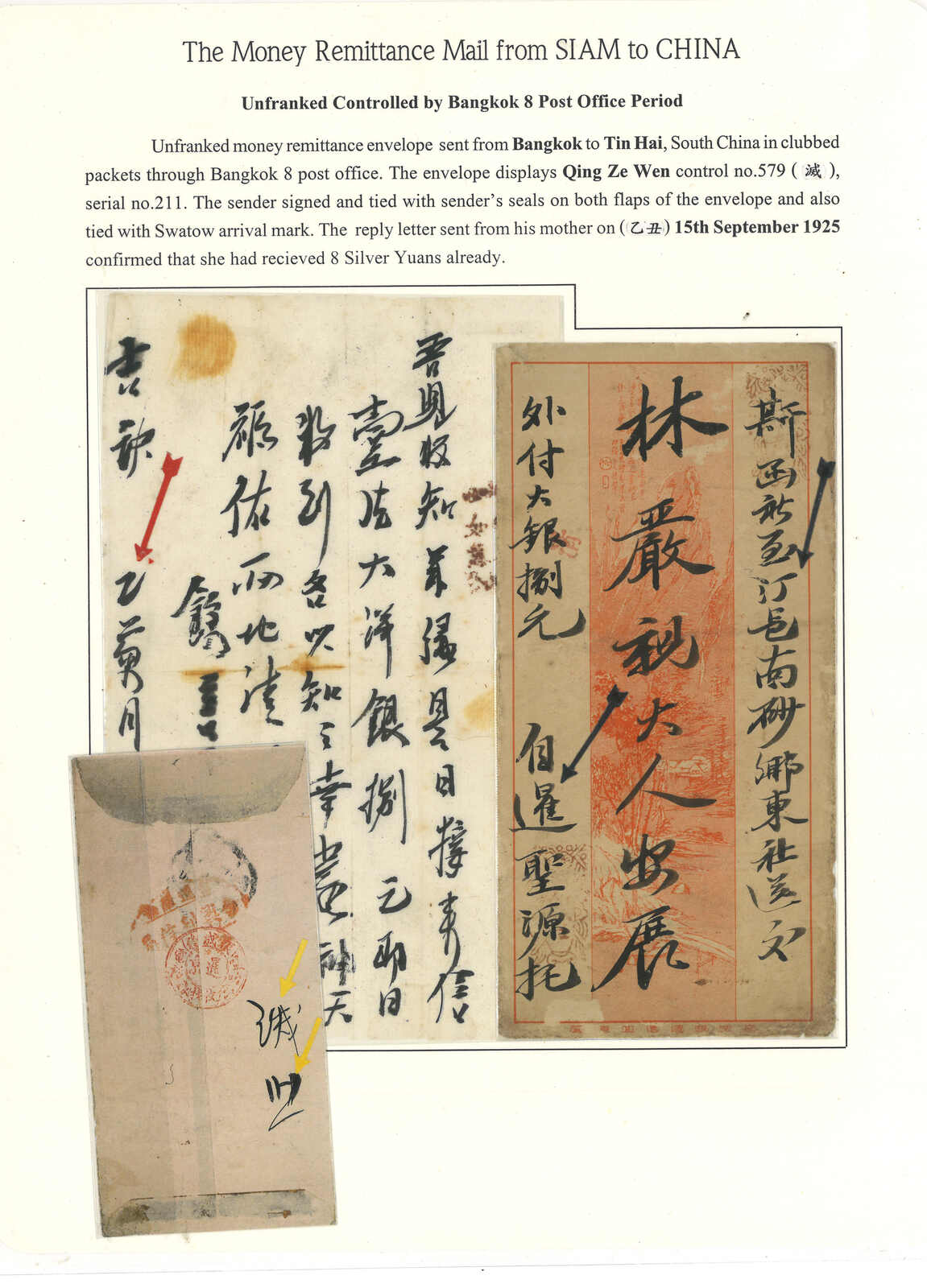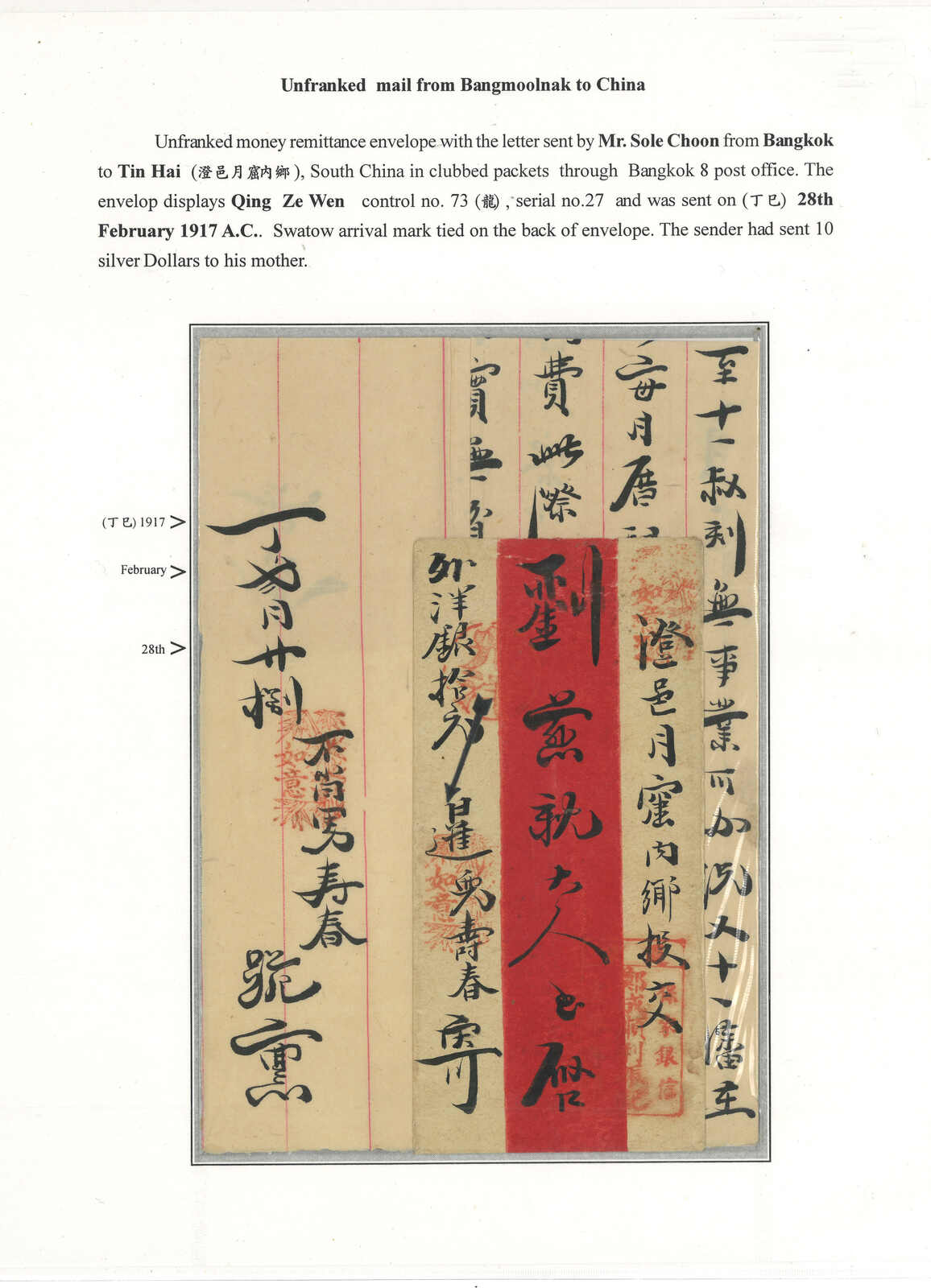 1919 Qiaopi (money remittance letter) from Bangkok to Jaoping, applied with Bangkok Qiaopiju oval and vertical seal. Arrived Swatow (Nov). As this type of Qiaopi were sent to China in bulk, no postmark of Siam Post was seen.