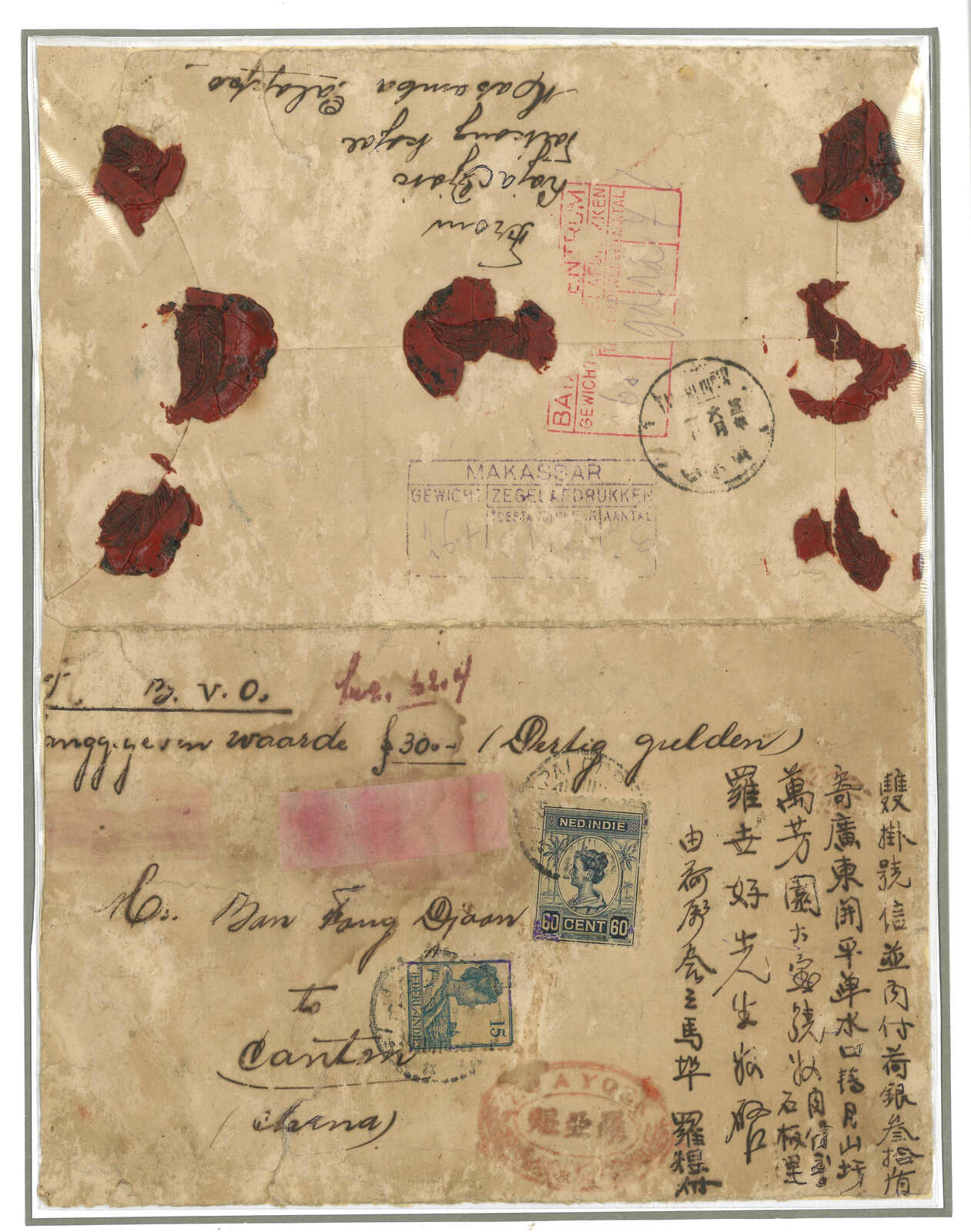 60分,銷Palopo日戳,旁鈐橢圓形批局戳記。背面蓋有望加錫計重戳記。6.1抵達。此寄款人將現金裝於信封中,經郵局送遞,十分難得少見。封剖開以作展示。(Image 1)