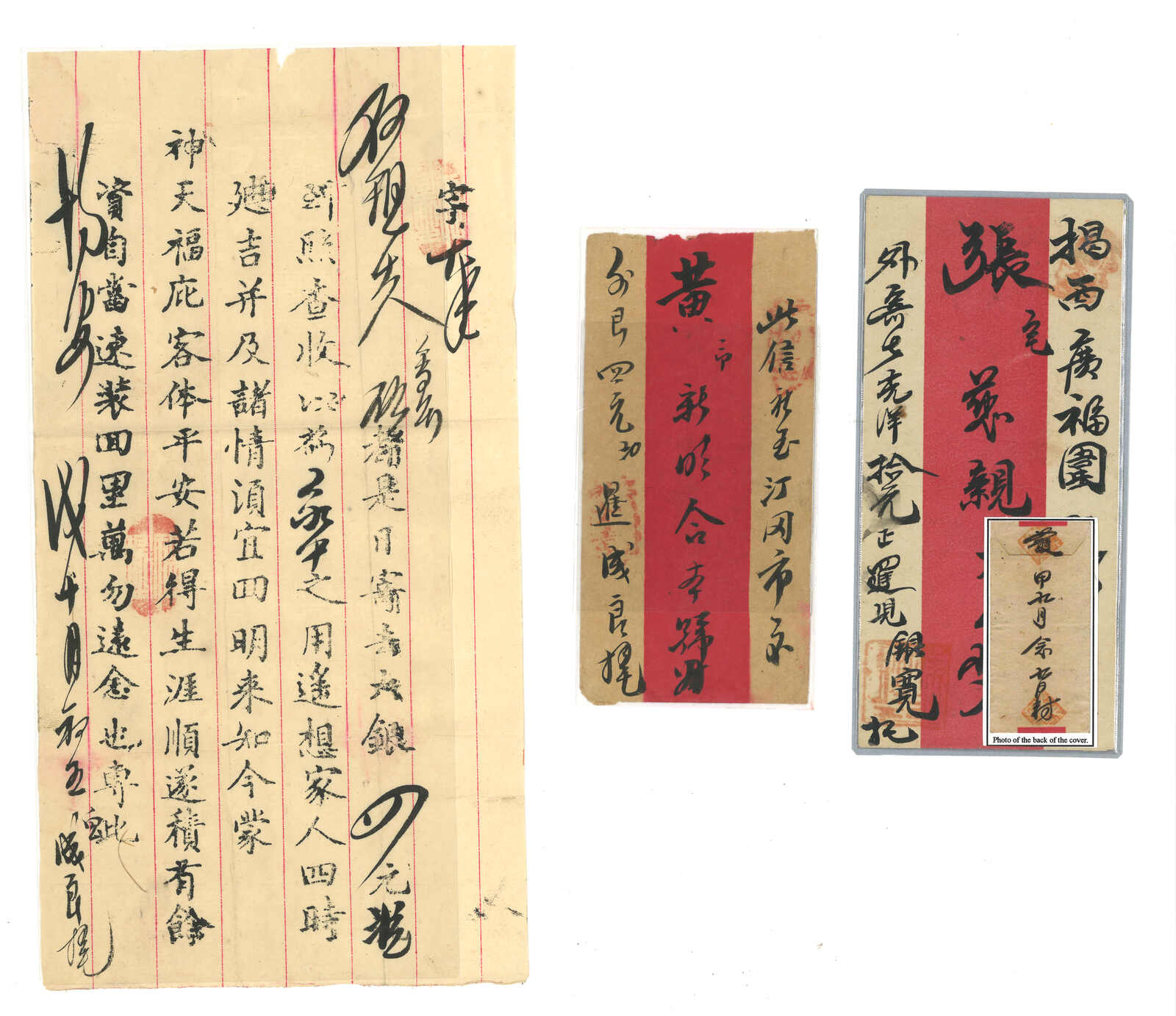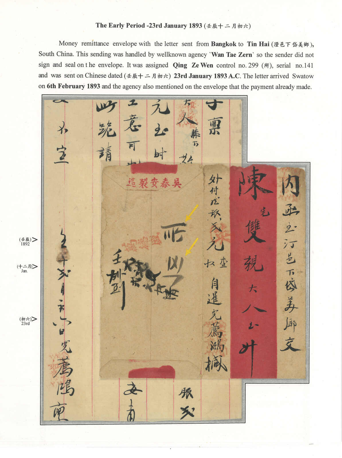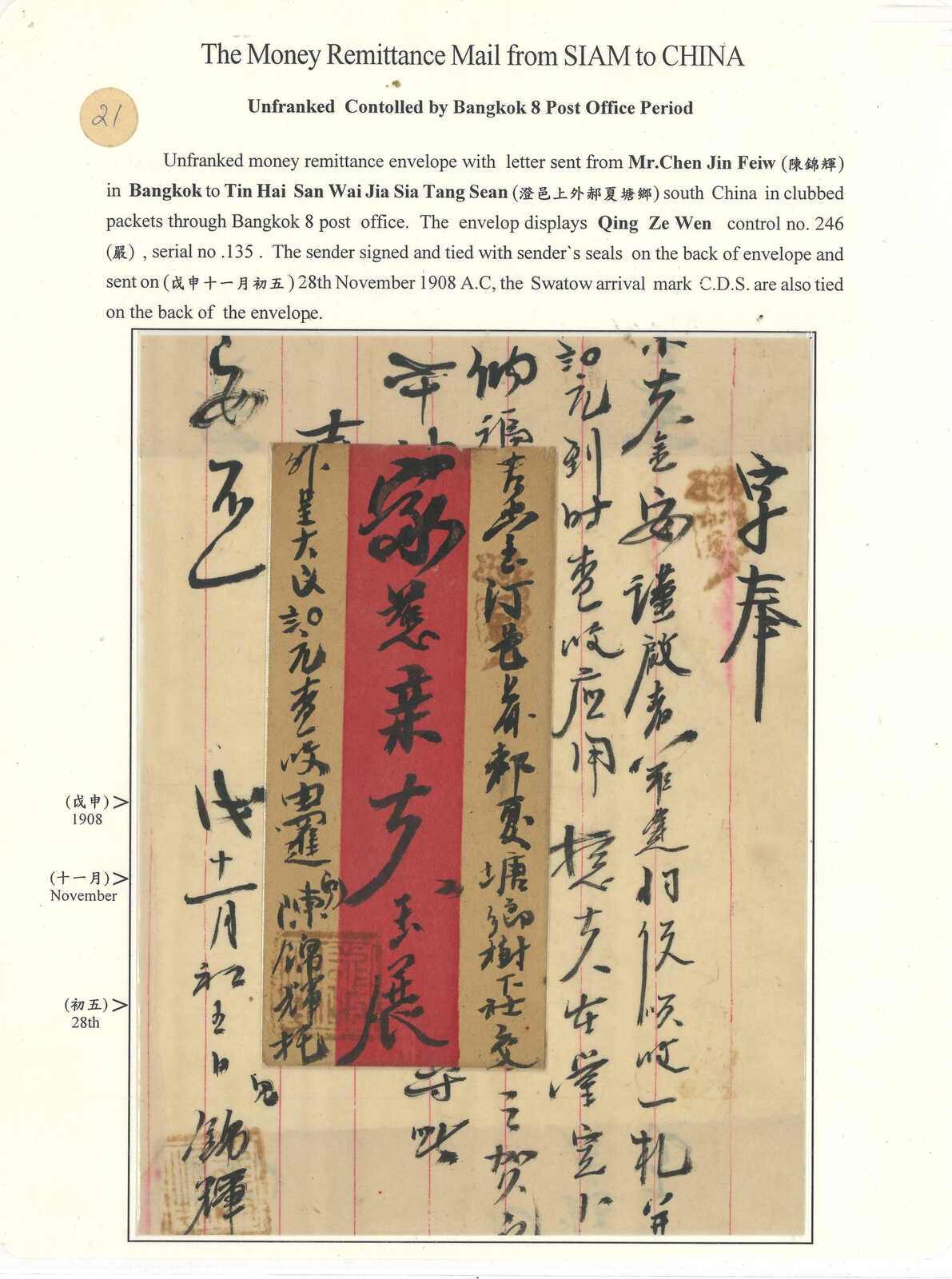 1900至1920年代一組九件曼谷寄中國之僑批紅條封,無貼票,鈐各批局直戳。部分附信。暹羅僑批大多總包寄出,但在1927起,郵局職員在檢查總包後會在僑批上加上郵戳。(Image 1)