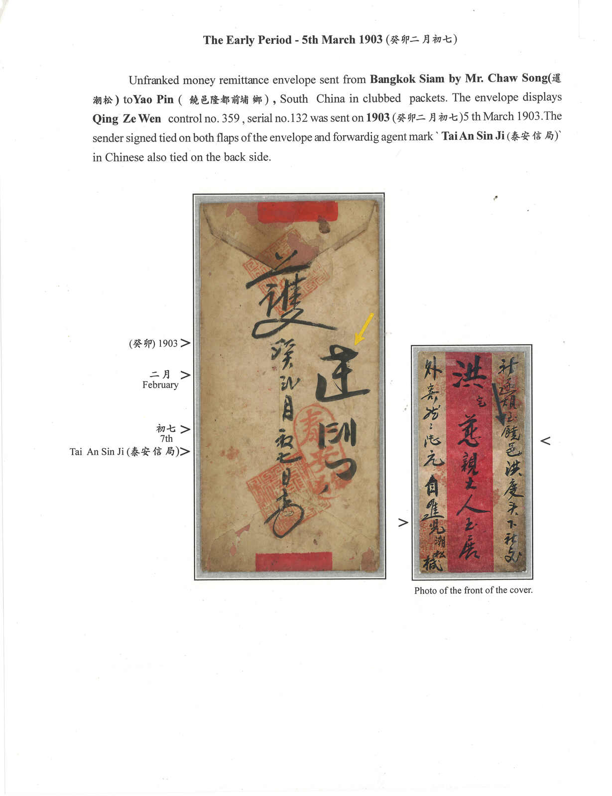 1907.2.27 僑批紅條封自曼谷寄饒平,鈐批局直戳、“重銀”戳記及手寫幫號。由於這類型僑批以總包寄中國,故無暹羅郵戳。附原信。(Image 1)