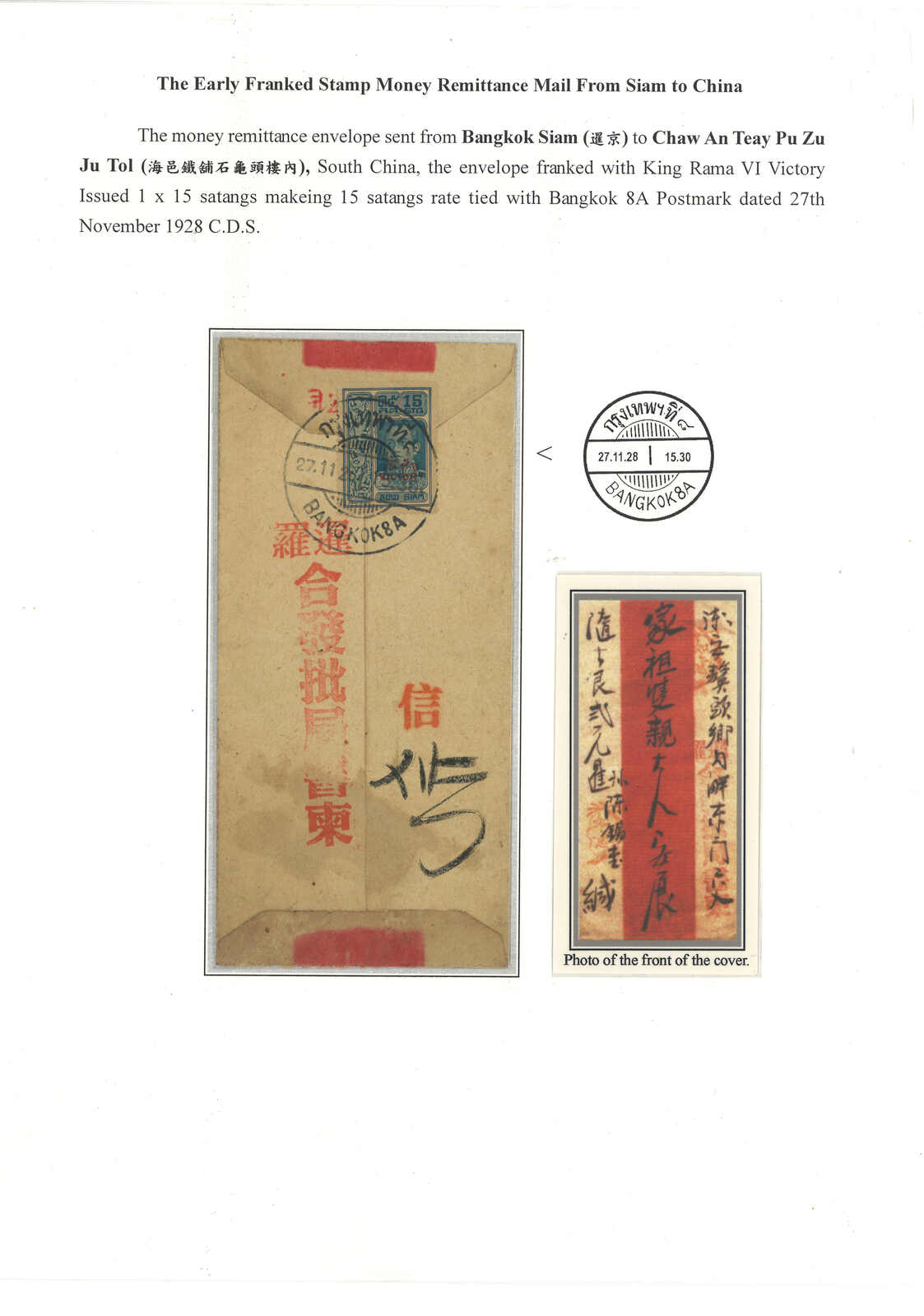 1928 (27 Nov) Qiaopi (money remittance letter) from Bangkok to Chowan, f.w. Rama VI ovpt. Victory issue 15 stg on reverse, tied by Bangkok 8A PO cds, alongside with Qiaopiju vertical seal and serial number.